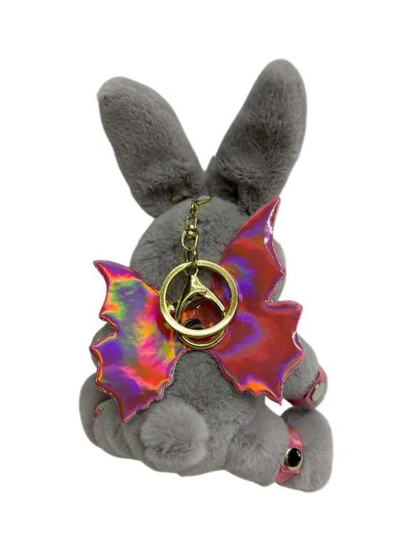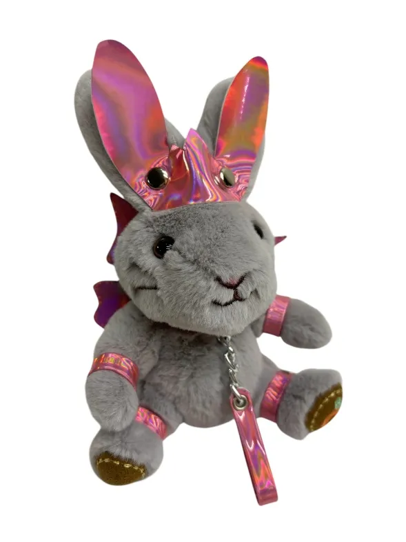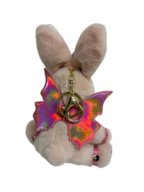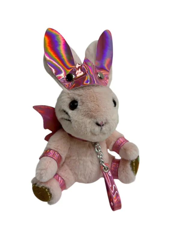 Зайчик- фея  попал в сладкий плен, поэтому на его шее красуется ошейник с поводочком, который не дает фее упархнуть от своего хозяина. Но крылышки все еще напоминают о его волшебной сути. Пристегните фею к своей второй половинке, чтобы она всегда была рядом! Игрушка оснащена карабином и кольцом, её можно носить в качестве брелока на ключах или сумке. Высота зайчика 18 см, очень удобный размер. Костюмчик выполнен из розовой голографической эко-кожи. Цвет зайчиков в ассортименте.