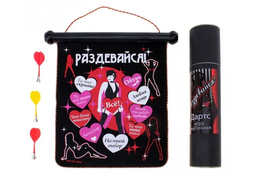Набор для игры в дартс двухсторонний. Набор содержит упаковочный тубус, текстильное поле и три магнитных дротика. Дротики не оставляют следов на стене и могут быть использованы в любой обстановке. На одной стороне поля нанесено обычное поле для игры в дартс, на обороте – поле для игры на раздевание. Игра проходит по обычным правилам, но вместо очков игроки пытаются попасть в участки поля с указанием вещи которую нужно снять.