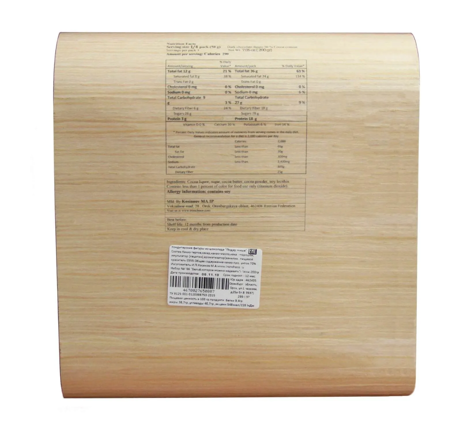какао тертое, сахар, какао-масло, какао-порошок, эмульгатор (лецитин), ароматизатор (ванилин), пищевой краситель Е555. Общее содержание какао продуктов: 70%.