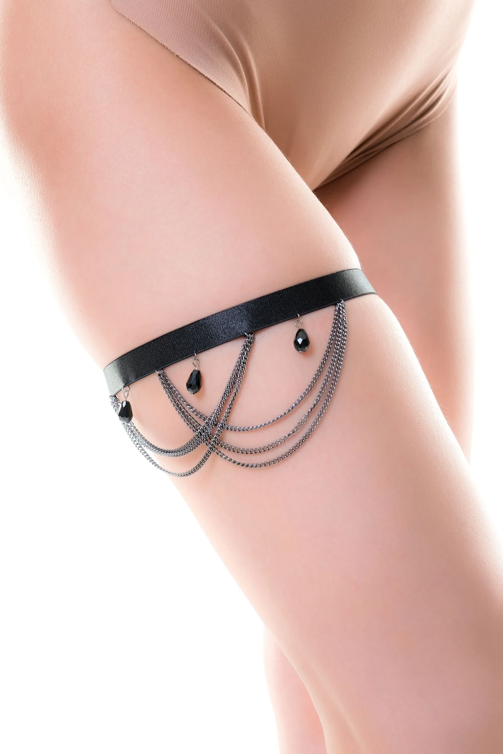 Стрепы - уникальный аксессуар, способный добавить сексуальных акцентов не только в эротическом, но и в повседневном образе! Украшение на ногу Kris Игривые капельки из черных страз и переплетения тонких металлических цепочек на эластичной ленте. В повседневном образе сочетайте с шортами или короткими юбками и платьями.