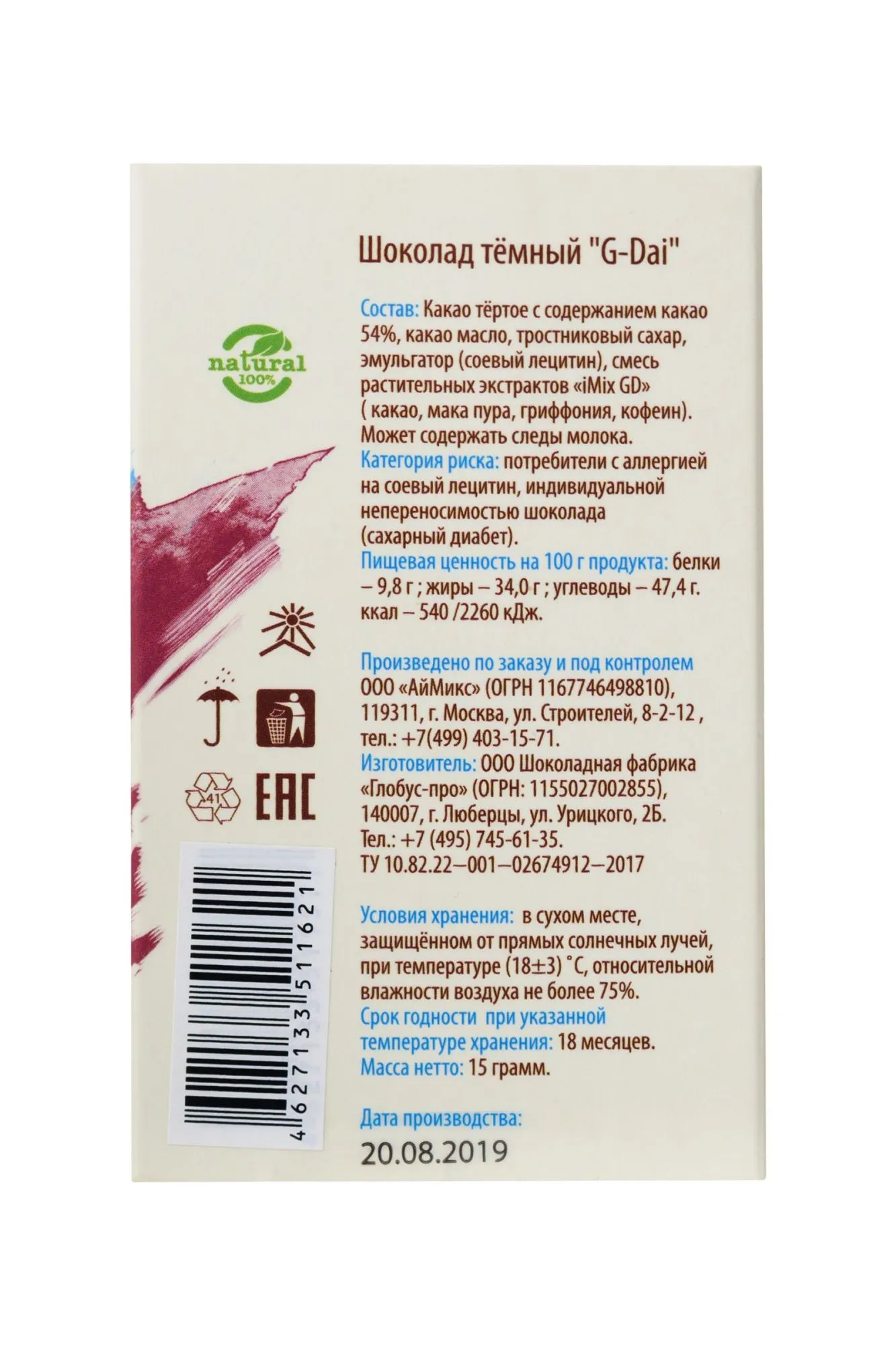 В составе шоколада G-Dai для женщин: темный шоколад Barry Callebaut (содержание какао 54%) и комплекс растительных экстрактов iMix GD. В этом шоколаде применена новая формула сочетания активных веществ, благодаря которой удалось добиться не только последовательного и пролонгированного действия афродизиаков, но и избирательности воздействия на мужчину и женщину. Кроме того, данный купаж афродизиаков наиболее гармонично сочетается со вкусом бельгийского шоколада. Шоколад G-Dai for women : настраивает на удовольствие; повышает либидо; способствует более ярким ощущениям во время секса. Достигается это благодаря содержащимся в его составе экстрактам афродизиаков – гриффонии, маки перуанской, семян какао. Гриффония «запускает» гормон счастья – серотонин, мака усиливает влечение, а экстракт семян какао делает мир цветным и сказочно прекрасным! Подробно о действии афродизиаков: Гриффония простолистная (или Бандейра простолистная, лат. Griffonia simplicifolia) представляет собой кустарник, используемый в традиционной народной медицине западной Африки. Местное население применяет семена гриффонии в качестве мощного афродизиака, стимулирующего эмоциональный и энергетический подъем. Дело в том, что Гриффония является крупнейшим источником вещества 5- гидрокситриптофан (5-НТР). Ее семена содержат до 20% 5-НТР по весу. Наше тело производит 5-НТР из триптофана, другой аминокислоты, найденной в белковых продуктах: мясо, курица, рыба, молочные продукты, бобовые и орехи. После поглощения 5-HTP переступает гематоэнцефалический барьер и превращается в серотонин - нейротрансмиттер, который играет немаловажную роль в регулировании настроения, тревоги, аппетита и сна. Может вызвать ощущение радости или даже сильной эйфории. Неудивительно, почему он называется «гормоном счастья». При стрессах, тревоге, эмоциональных расстройствах возникает дефицит серотонина, поскольку большая часть триптофана метаболизируется в другие соединения, а еще меньше поступает в организм при несбалансированном употреблении белков и углеводов. При этих условиях триптофан недоступен для биосинтеза серотонина, а вот для 5-гидрокситриптофана таких проблем не существует. 5-НТР хорошо абсорбируется сублингвально, т.е. в ротовой полости. И шоколад хорошо этому способствует. Мака перуанская – это известный многим сильный афродизиак. Обилие минералов, жирных кислот, присутствие цинка, йода позволяет нормализовать баланс половых гормонов, повысить настроение, усилить сексуальное возбуждение. Экстракт какао относится к биологически активным соединениям, которые содержатся в какао-продуктах. Эти соединения включают флавонолы, процианиды и эпикатехин. Хотя эти молекулы содержатся не только в какао, экстракт какао содержит особенно высокие уровни эпикатехина по сравнению с другими растительными продуктами. Употребление эпикатехина увеличивает выработку оксида азота, молекулы, которого расширяют кровеносные сосуды и улучшает кровоток. Состав: Какао тертое c содержанием какао 54%, смесь растительных экстрактов «iMix GD» (гриффония, семена какао, мака пура, кофеин), какао масло, тростниковый сахар, эмульгатор (соевый лецитин). Противопоказания: не рекомендуется применять при наличии аллергии на компоненты в составе, людям с сахарным диабетом. Способ применения: Наибольший эффект достигается при упо