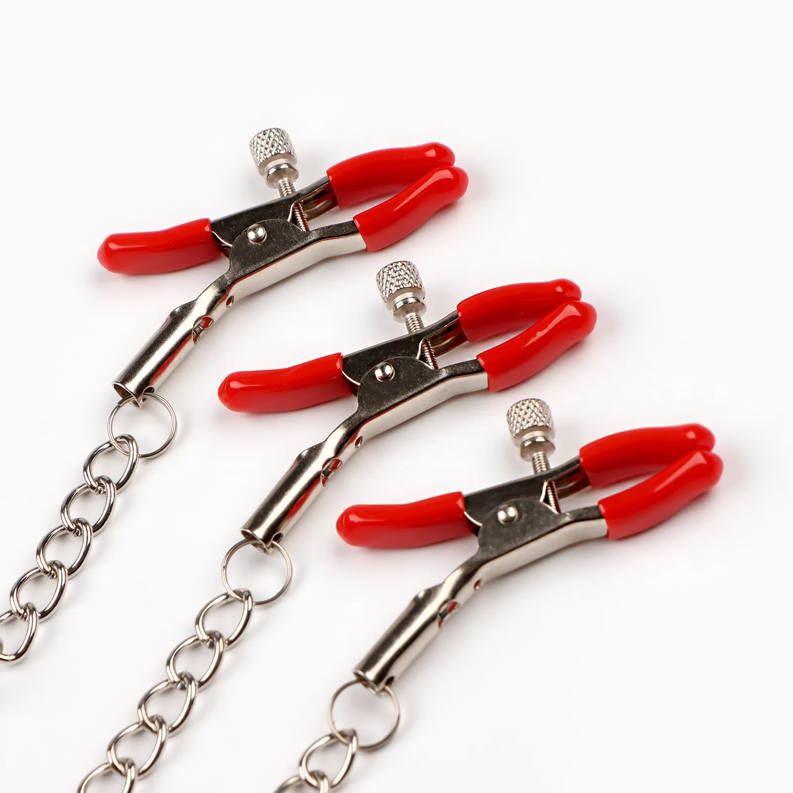 Зажимы для сосков и клитора изготовлены из алюминия, изделие имеет пластиковые наконечники. Длинная цепь позволяет одновременно использовать зажимы для сосков и клитора. Соединяющая цепочка является не только красивым дополнением, но и позволяет оттягивать и вращать соски для получения дополнительных приятных ощущений. Можно использовать как самостоятельный стимулятор, а также как дополнение к прелюдии и сексу.