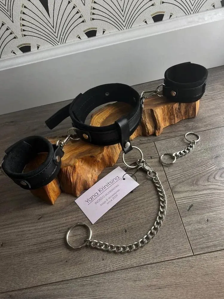 Наручники сделаны из натуральной кожи черного цвета и соединены между собой карабином. Они регулируются по размеру при помощи ремешков с пряжками.