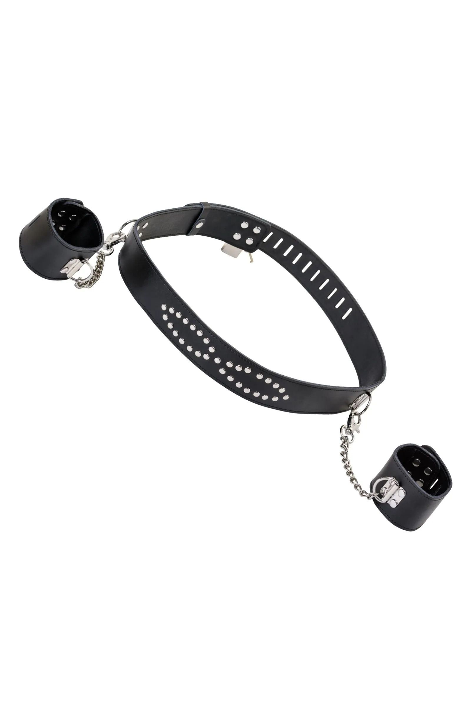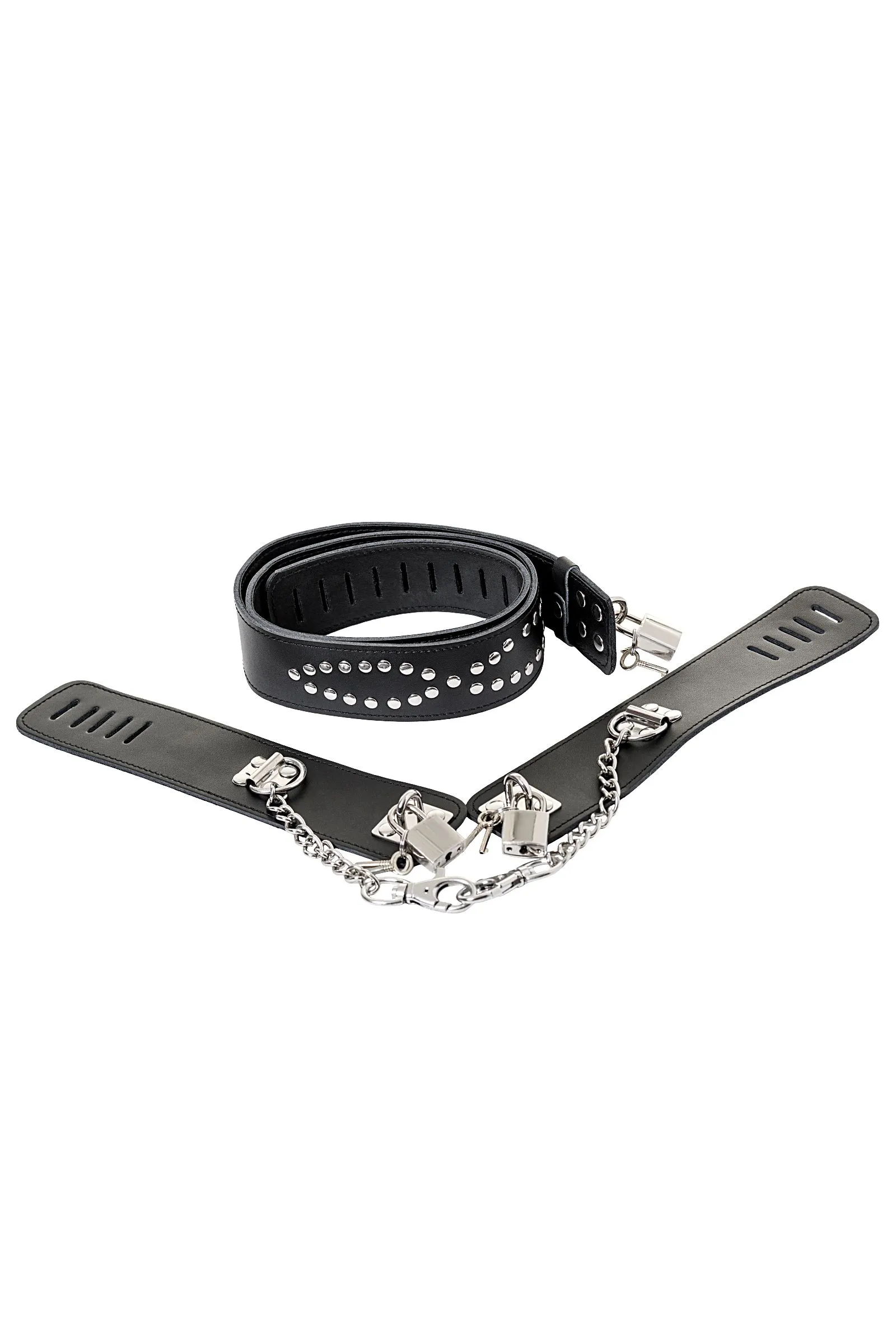 Этот бондажный набор станет превосходным дополнением к играм с фиксацией партнёра. Ведь он обладает для этого всеми необходимыми качествами: •    сковывает руки на 15-сантиметровом расстоянии от талии; •    не натирает благодаря тому, что изготовлен из мягкой кожи; •    подходит к различным игровым сценариям, поскольку выполнен в классическом стиле. С данным набором интимные игры становятся ярче, а впечатления от секса мощнее!