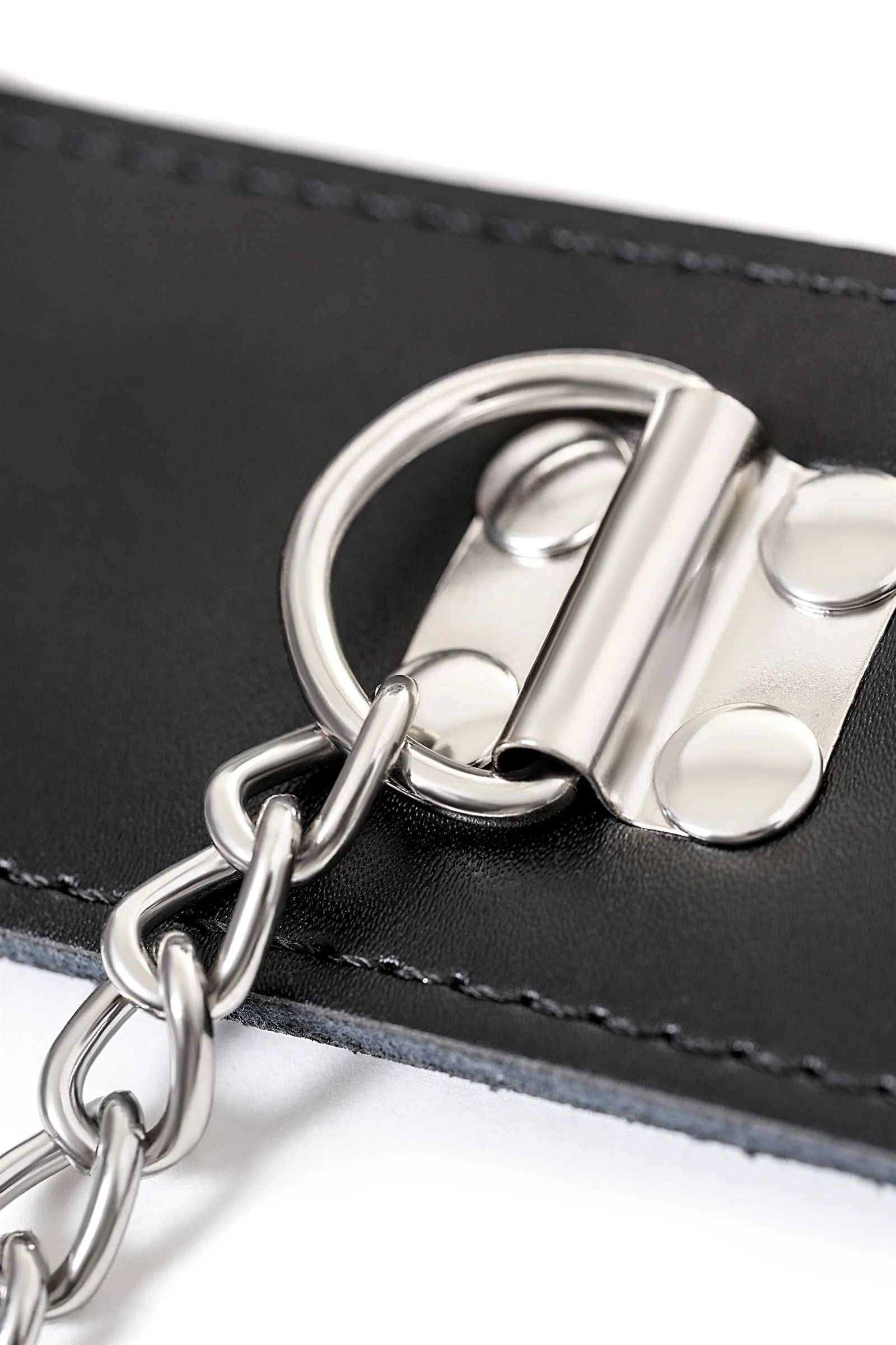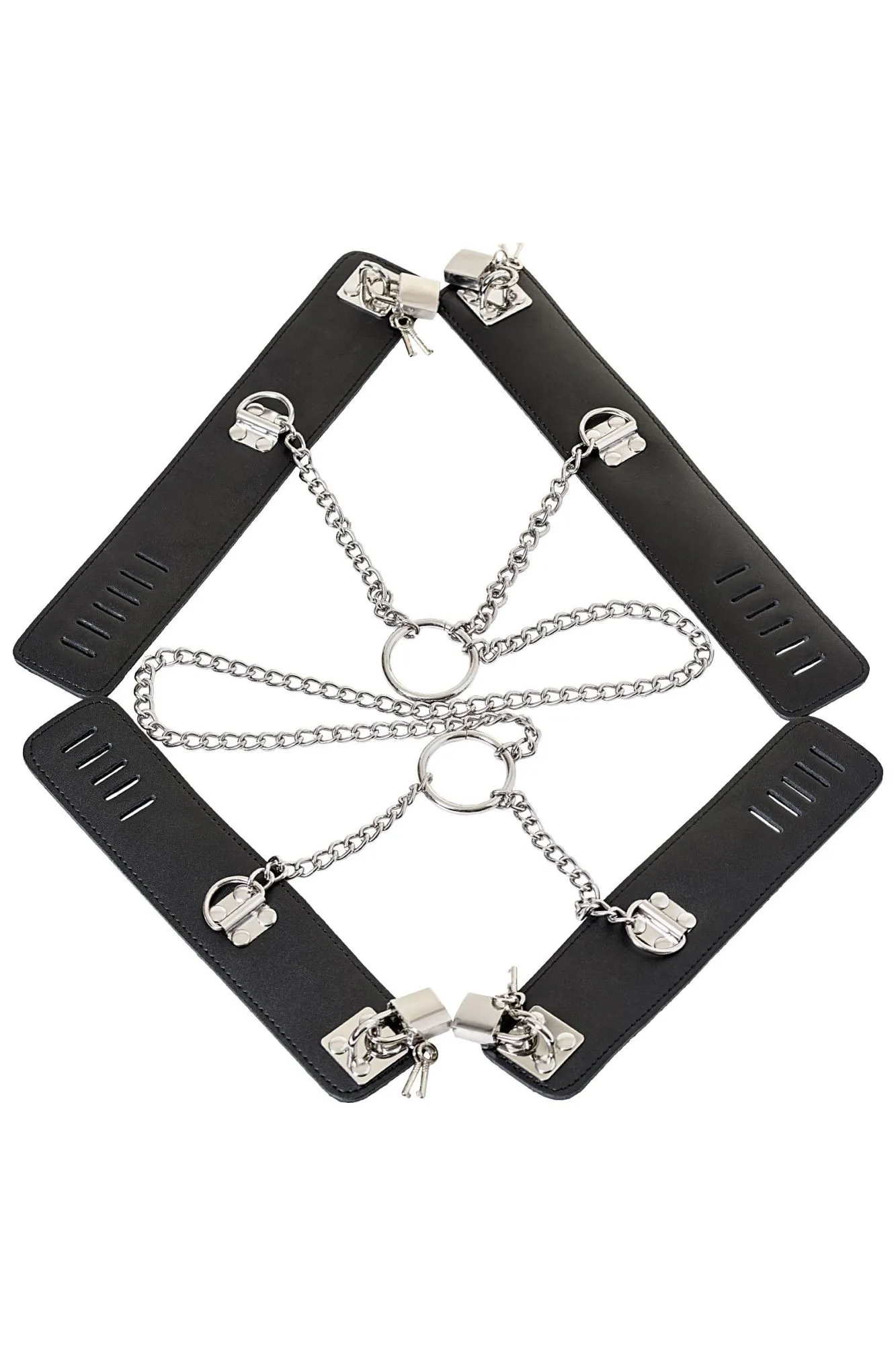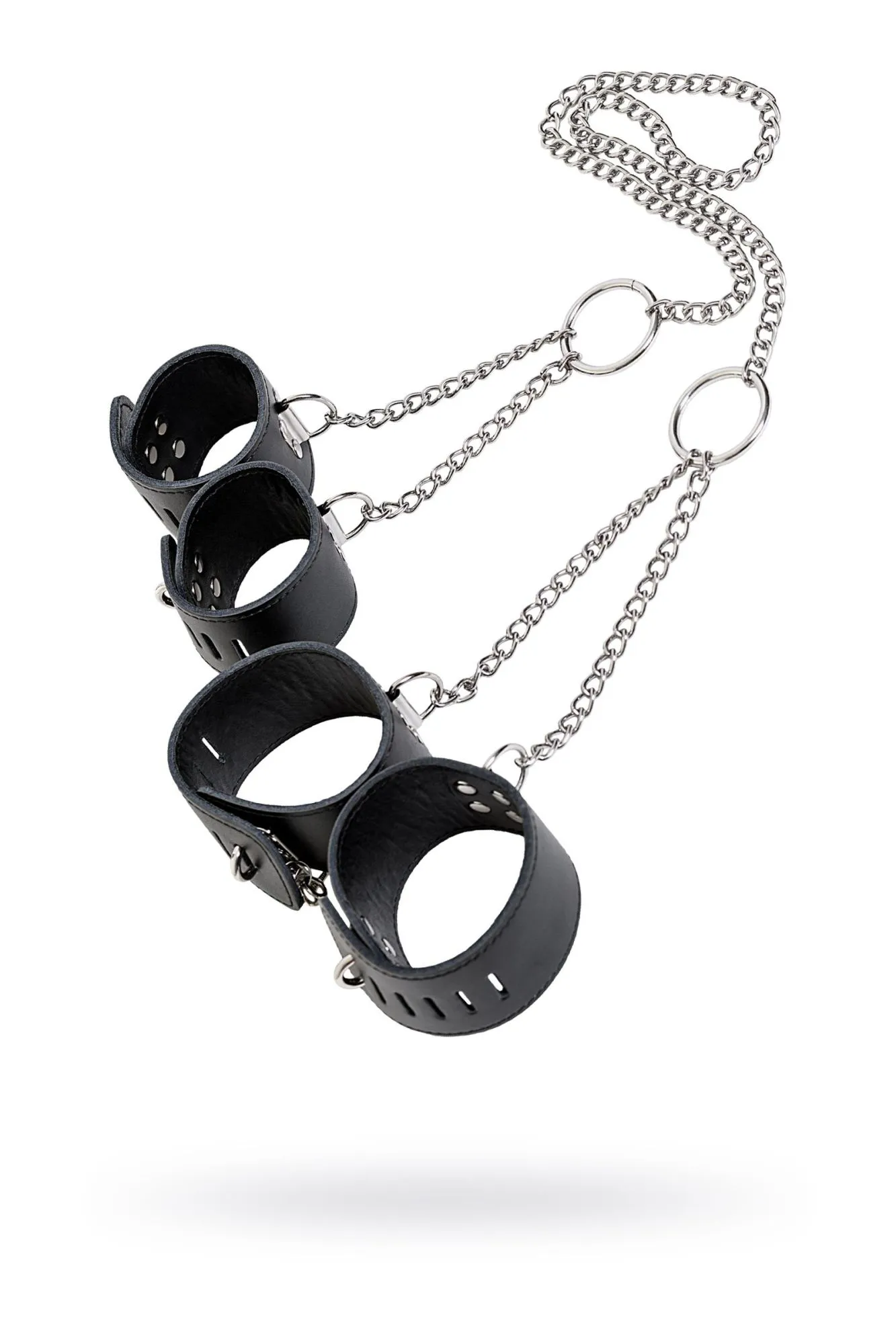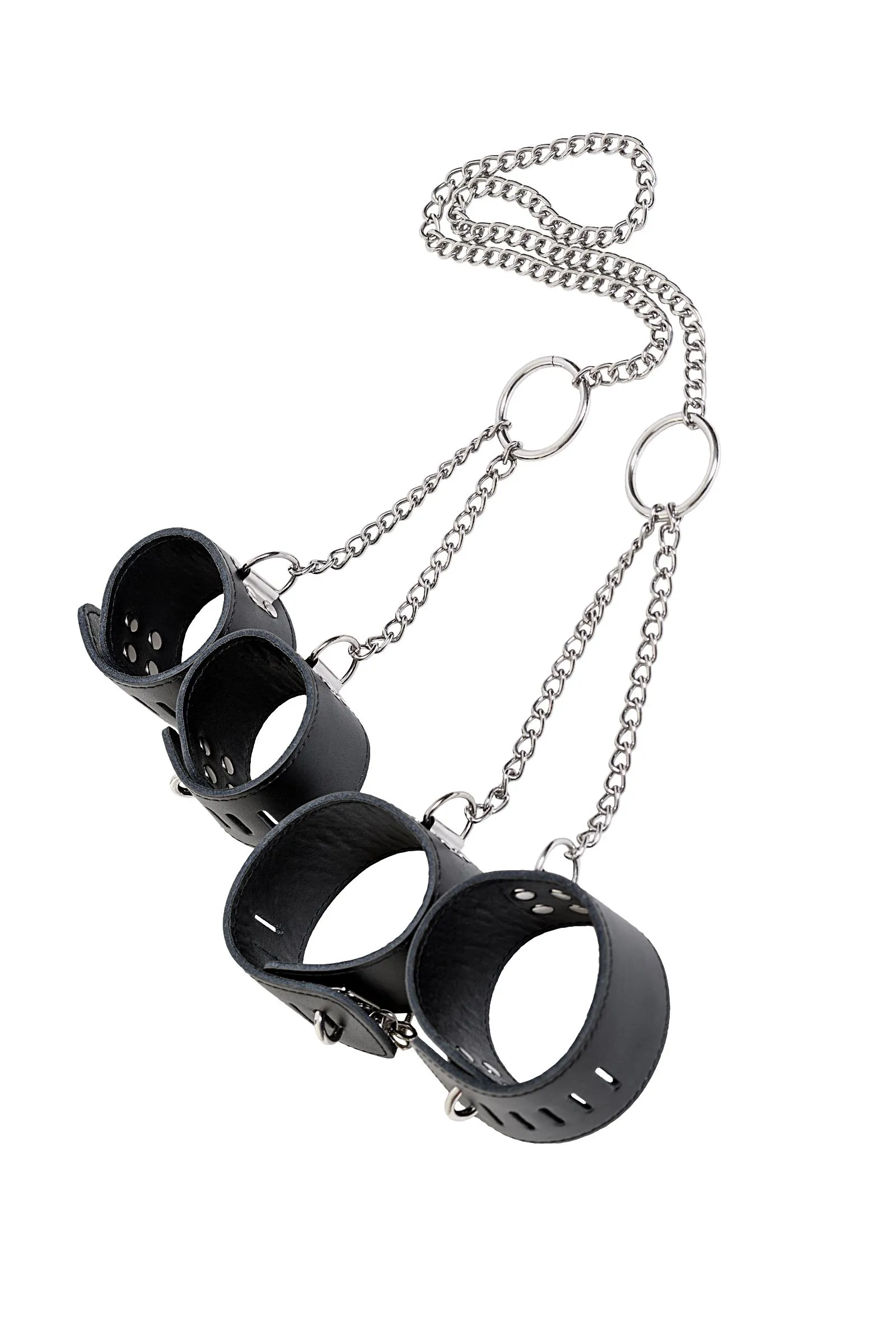 Данная бондажная сцепка состоит из наручников и оков, соединённых металлической цепью. Расстояние между манжетами составляет 25 см, цепочка между руками и ногами — 70 см, фиксация — с помощью замков. Такая сцепка не только максимально ограничит свободу партнёра, но и не нанесёт вред рукам и ногам.