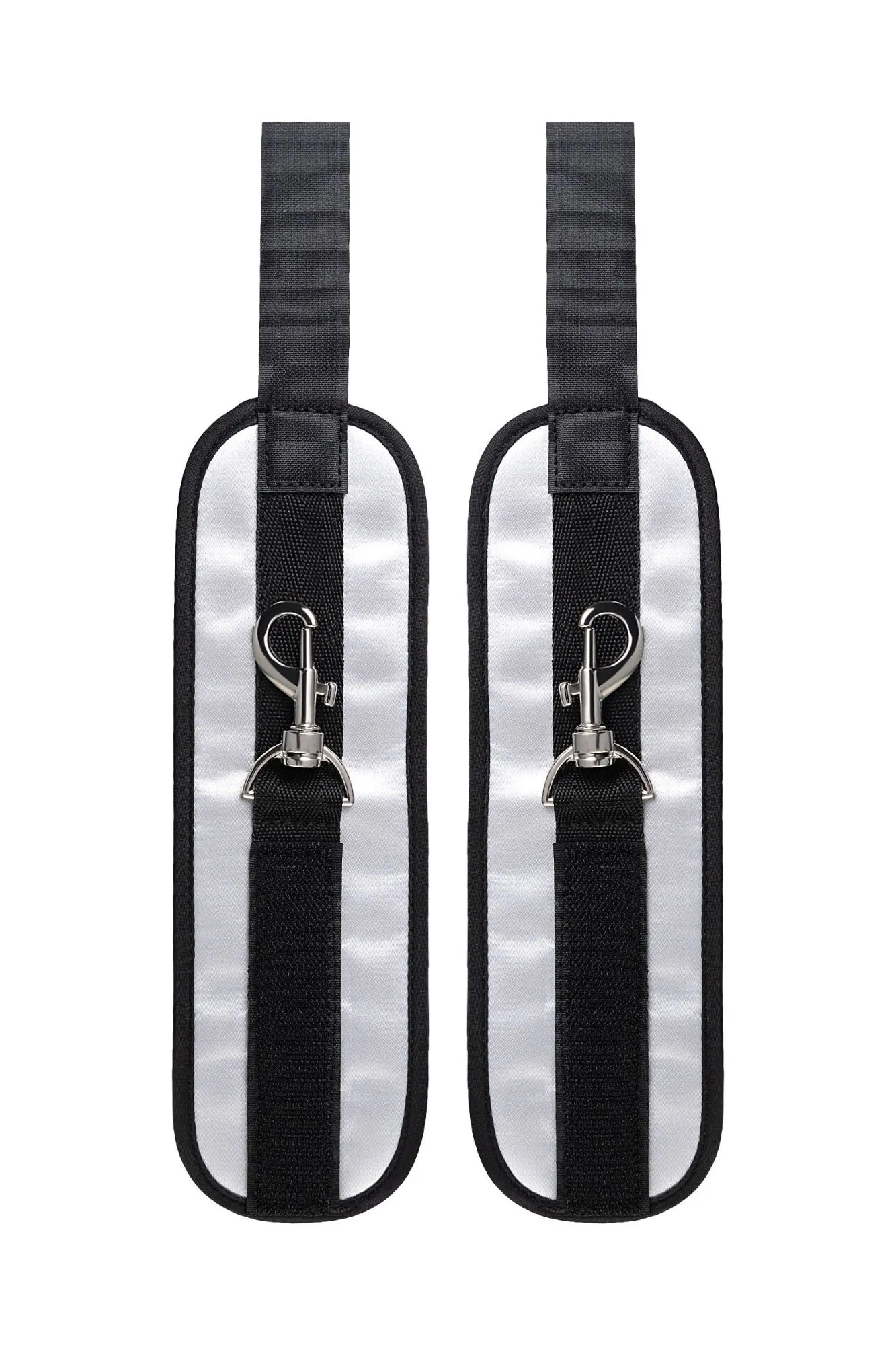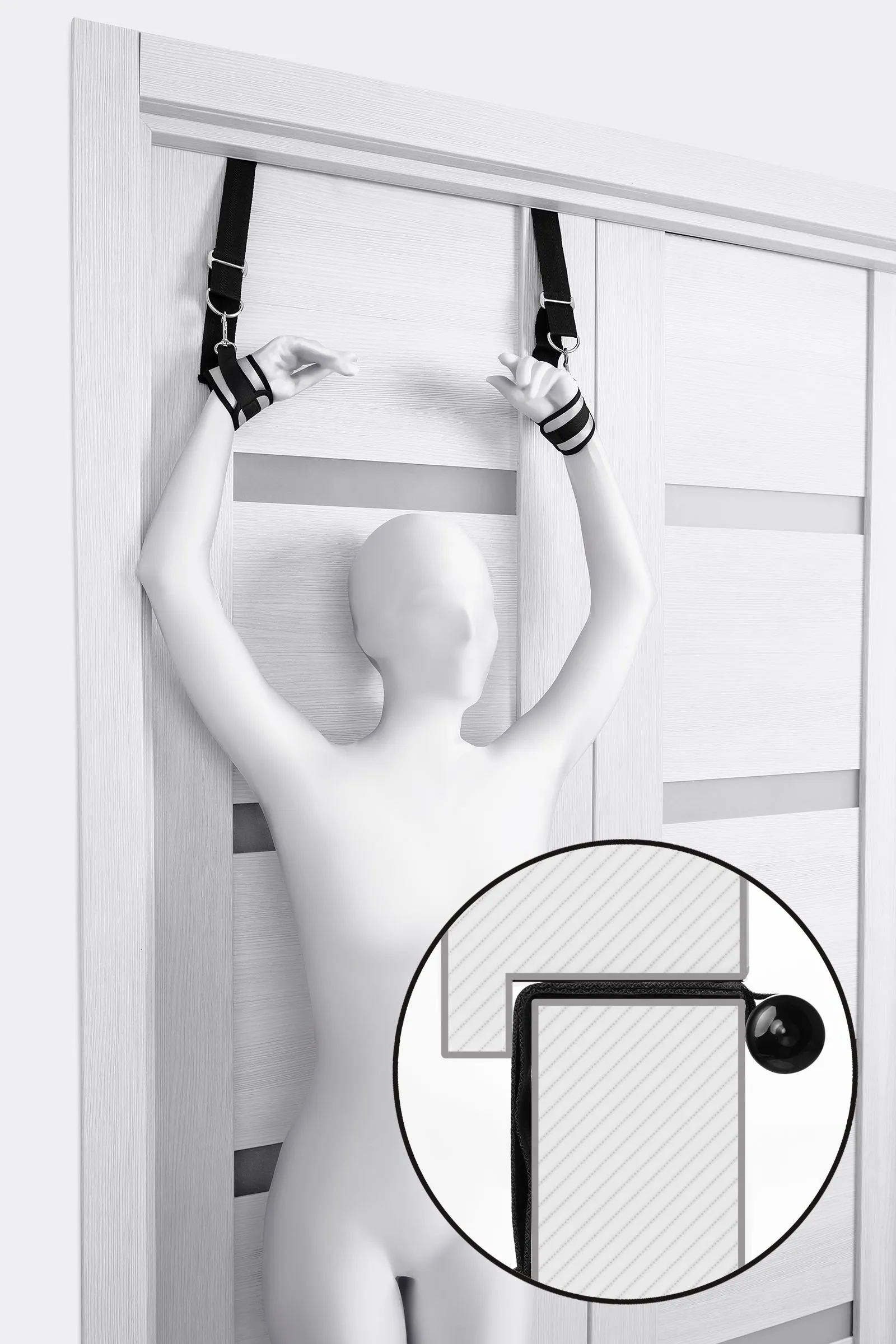 Оставьте наручники и кровать в прошлом веке, пора играть по-взрослому. Фиксаторы для рук на дверь для смелых и терпеливых. Больше позиций для получения удовольствия без силовых затрат! Пластиковые цилиндры фиксируются за дверью, наручники крепятся на запястьях с помощью застежки велкро. Размер легко регулируется ремешками и подойдет для запястий любого размера. Серебряный цвет с черными ремешками смотрится элегантно. Внутренняя часть наручников мягкая и не доставляет дискомфорта во время использования. Фиксаторы с помощью двери дают вам больше свободы для реализации фантазий. Не нужно напрягаться, чтобы удерживать руки вверху, не нужно контролировать своего партнера, если хочется удержать его стоя. Эта оригинальная форма бандажа выведет вас на новый уровень наслаждения с доверием. Материал: полиэстер, полипропилен, ABS-пластик Общая длина наручников: 23 см Длина ремней: 26 см Ширина наручников: 7 см Диаметр цилиндра: 2,5 см