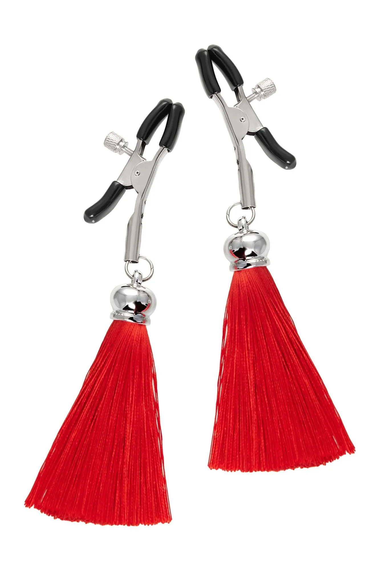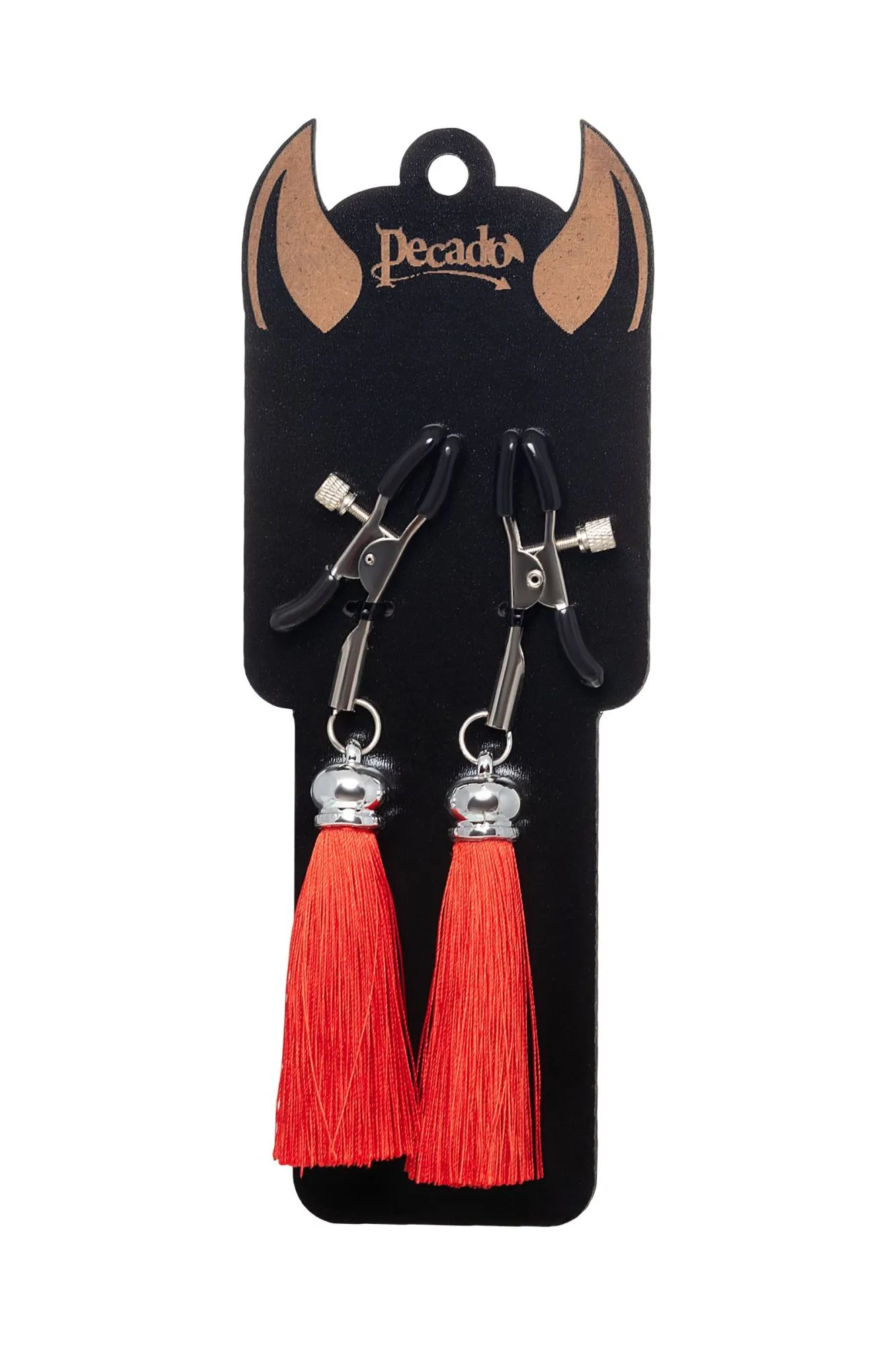Хотите усилить ощущения от страстных игр с партнером? Увеличить степень возбуждения до невозможного можно с помощью зажимов-прищепок ручной работы от Рecado. Невероятно сексуальный аксессуар пробудит фантазию и повысит чувственность эротических зон. Мягкие резиновые накладки оберегают соски от повреждений. Металлический винт регулирует степень сжатия зажимов: от нежно-приятного до сильно-грубого. На концах черные резиновые наконечники, для безопасного воздействия на нежные участки тела. Компактный размер удобно вмещается как в женскую, так и в мужскую руку. Кисточки из натурального шелка не только визуально украшают эротический атрибут, но и еще утяжеляют его. Для самых смелых и искушенных любителей доминировать и подчиняться. ● Ручная работа. ● Надежная высококачественная фурнитура. ● Общая длина зажимов 14 см, длина кисточки 8,5 см. ● Не требуют специального ухода.