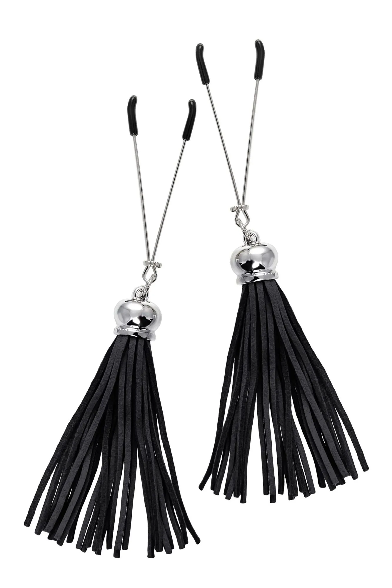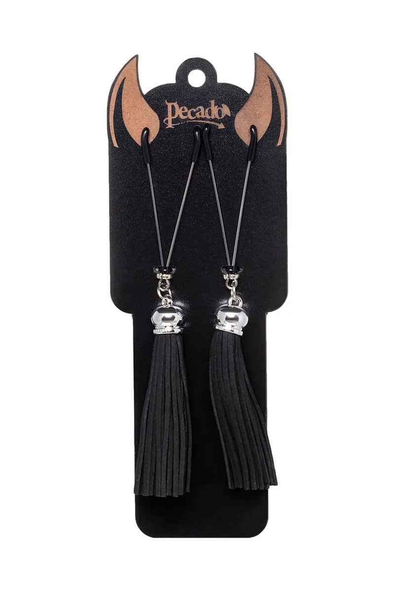 Попробуйте новые, дерзкие ощущения глубокого наслаждения! Зажимы-вилки от Pecado гарантируют смешение ярких чувств от тактильного контакта с нежной кожей сосков. Зажимы выполнены из высококачественных материалов. Металлическая часть компактная, приятная на ощупь. На концах черные резиновые наконечники, для безопасного воздействия на эрогенные зоны. Интенсивность сжатия аксессуара регулируется миниатюрными колечками. В зависимости от личных предпочтений и сценария игры, можно выбрать легкое пощипывание, или сильное сдавливание. Бахрома из натуральной замши, черного цвета, добавляет манящую красоту смелому атрибуту. При каждом соблазнительном покачивании груди, кисточки движутся в пикантном ритме. Также подходит для стимуляции и возбуждении в области половых губ и клитора. ● Ручная работа. ● Надежная высококачественная фурнитура. ● 100% натуральная замша. ● Не требуют специального ухода.