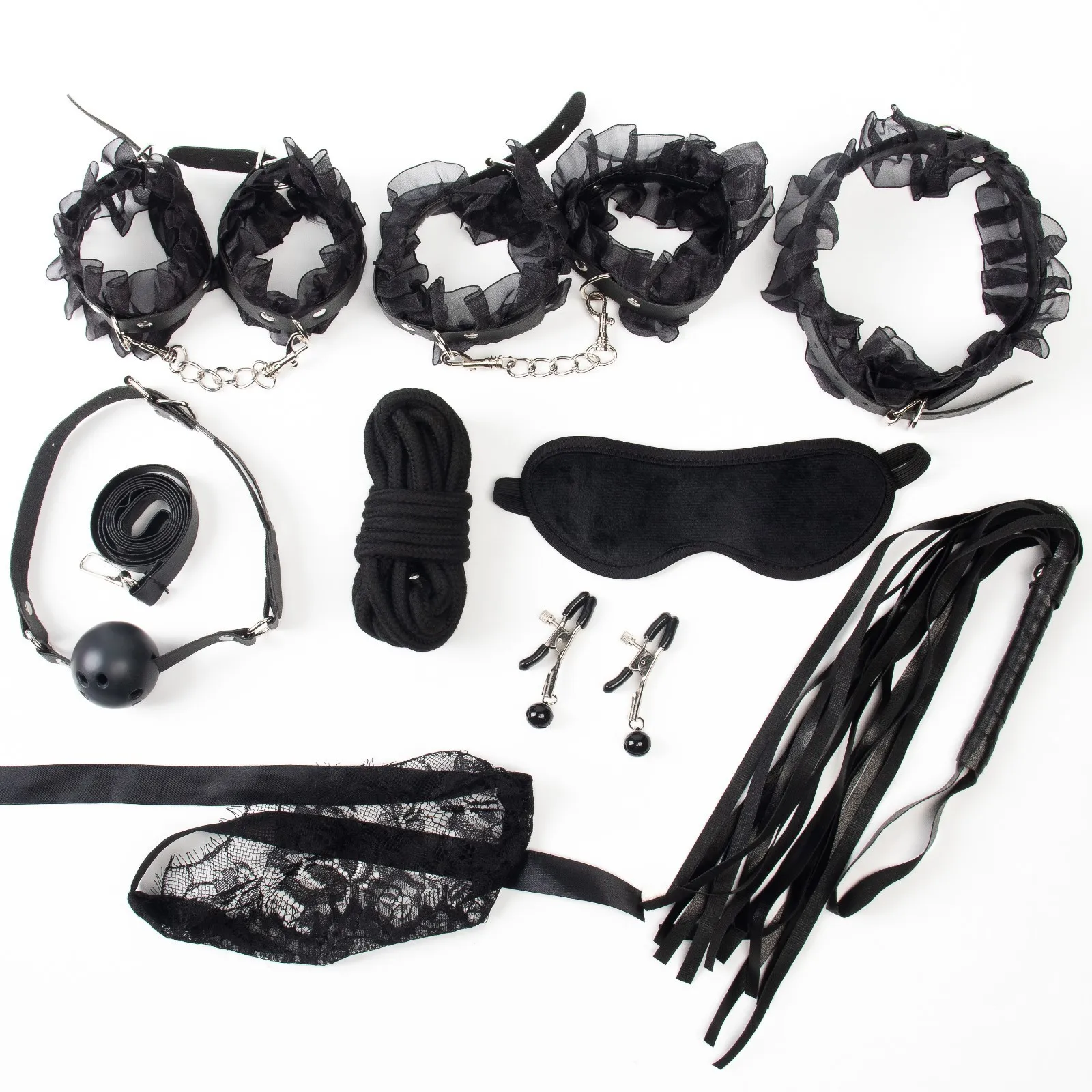 БДСМ набор выполнен из эко-кожи с кружевом - контраст нежности и грубости. Все ремни имеют систему регулировки. В состав набора входят 9 предметов: наручники, оковы, кляп, ошейник, поводок, верёвка, маска, зажимы для сосков, плеть.