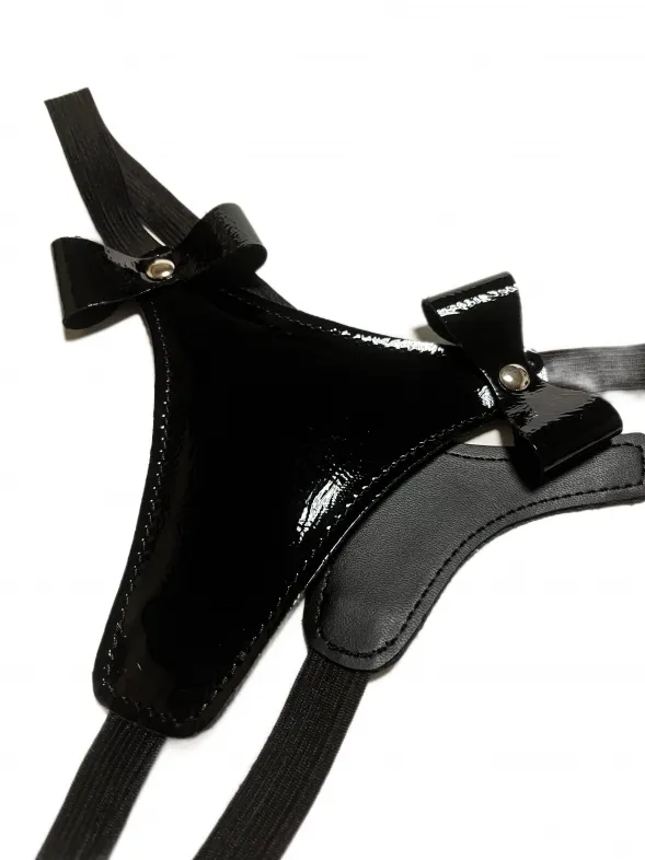 Сексуальные черные стринги, выполненные из эко-кожи. Декорированы спереди двумя бантиками. Лицевая сторона выполнена из лакового материала, а внутренняя из матового. Благодаря эластичной резинке, отлично сядут по фигуре, подойдут на размеры 40-46. Очень красивая и удобная модель, которая поможет создать дерзкий сексуальный образ для вашей любовной игры! Материал: эко-кожа, эластичная резинка, металл Цвет: черный
