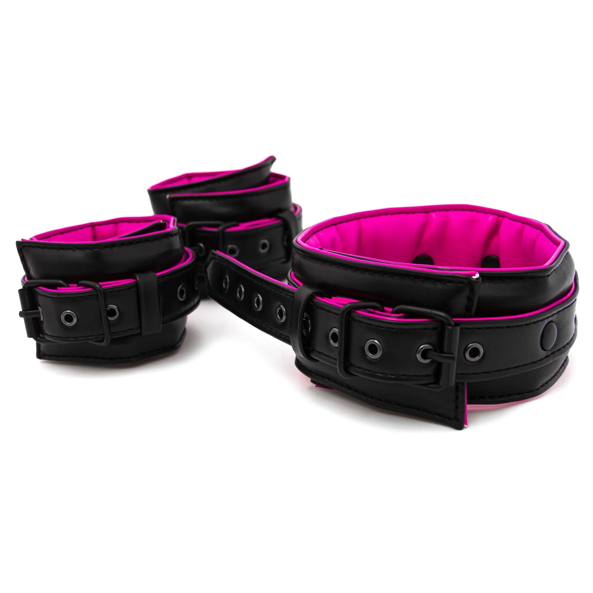 В бондажный набор входят ошейник с поводком, наручники и поножи. Каждый элемент выполнен из искуственной кожи чёрного и рзового цвета, размеры регулируются ремешками с пряжкой. В отделке использована фурнитура из металла и пластика. Такой набор отлично подходит для любовных игр в стиле БДСМ!