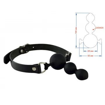 Силиконовый кляп в виде, последовательно расположенных, трех сфер, прикреплен к ремешкам из натуральной кожи. Регулируется кляп при помощи металлической пряжки. Металлическая фурнитура имеет никелевое покрытие. Общая длина 59 см. Max диаметр шара 38 мм, длина кляпа 10 см. Ширина ремешков 20 мм.