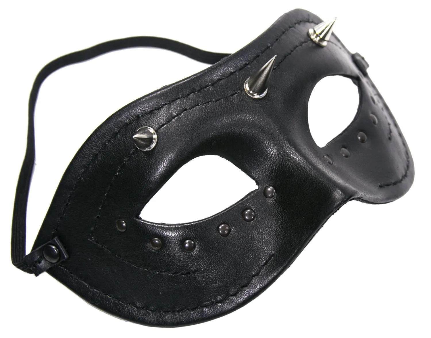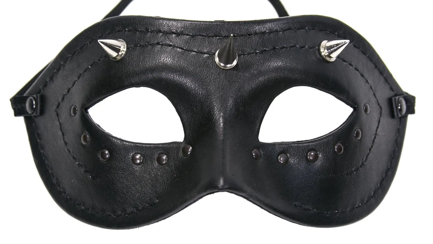 Эротическая черная маска на глаза с озорным взглядом. Маска изготовлена из кожи, декорирована шипами и клепками. У нее универсальный размер.