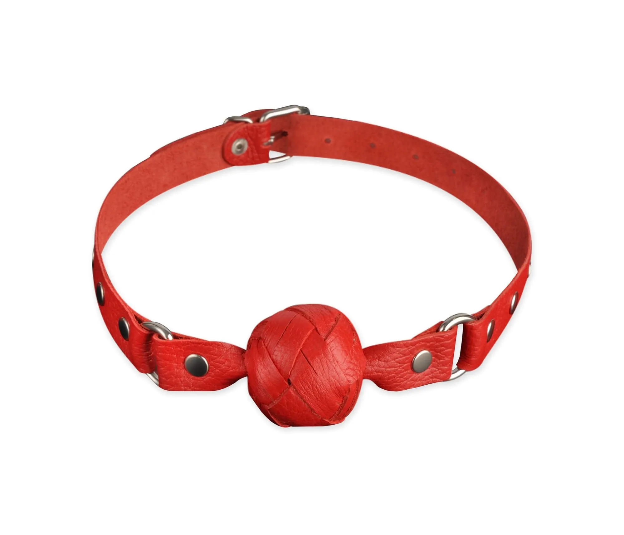 Кляп выполнен из натуральной кожи красного цвета. Его размер можно регулировать при помощи ремешка с пряжкой.