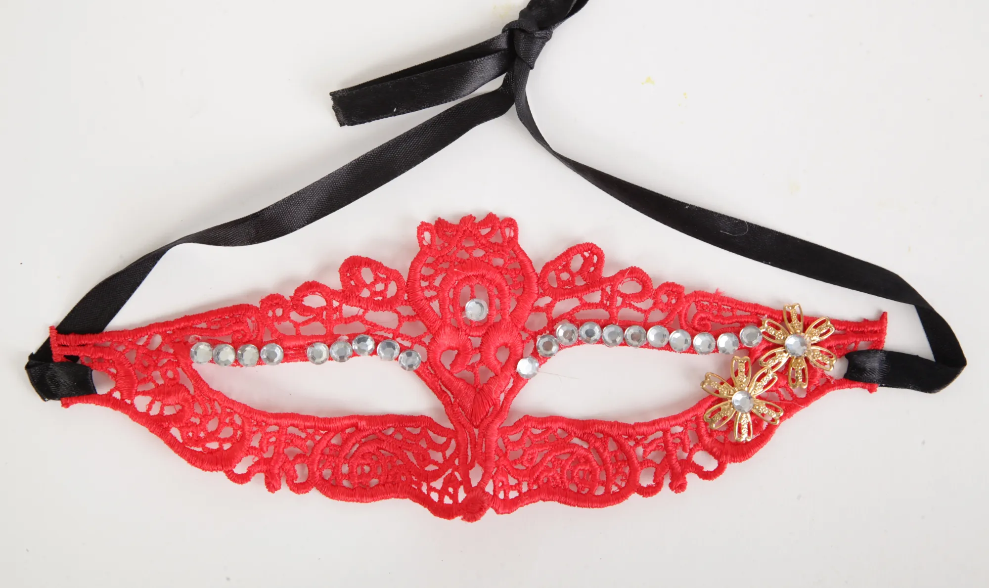 Красная кружевная маска в венецианском стиле с многочисленными узорами, стразами и цветочками. Завязывается на атласные черные ленты. Размеры маски: длина- 22,5 см, ширина - 8,5 см. Упаковка- картонный конверт.