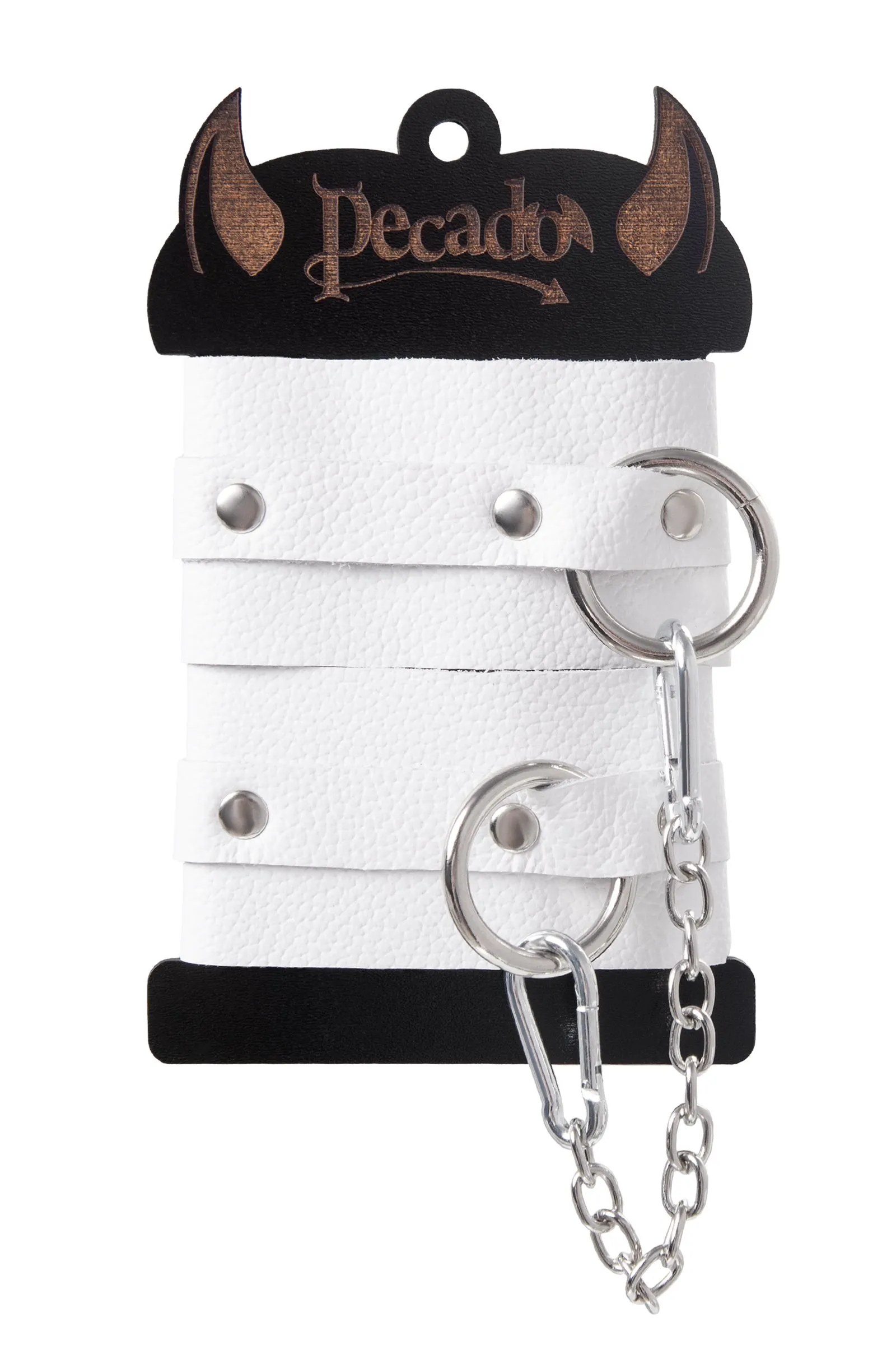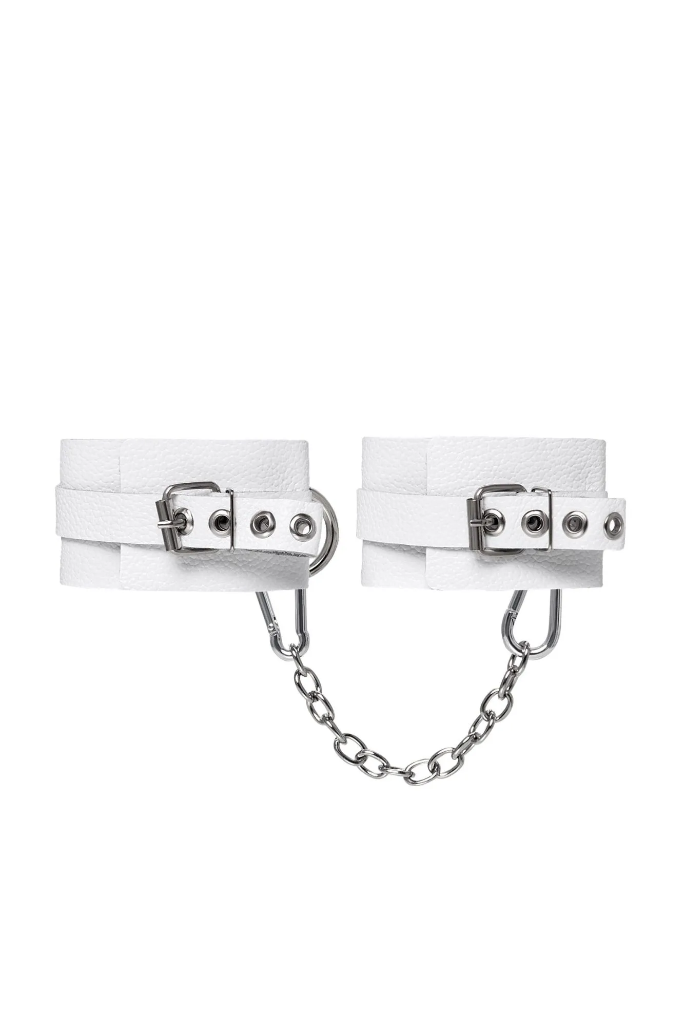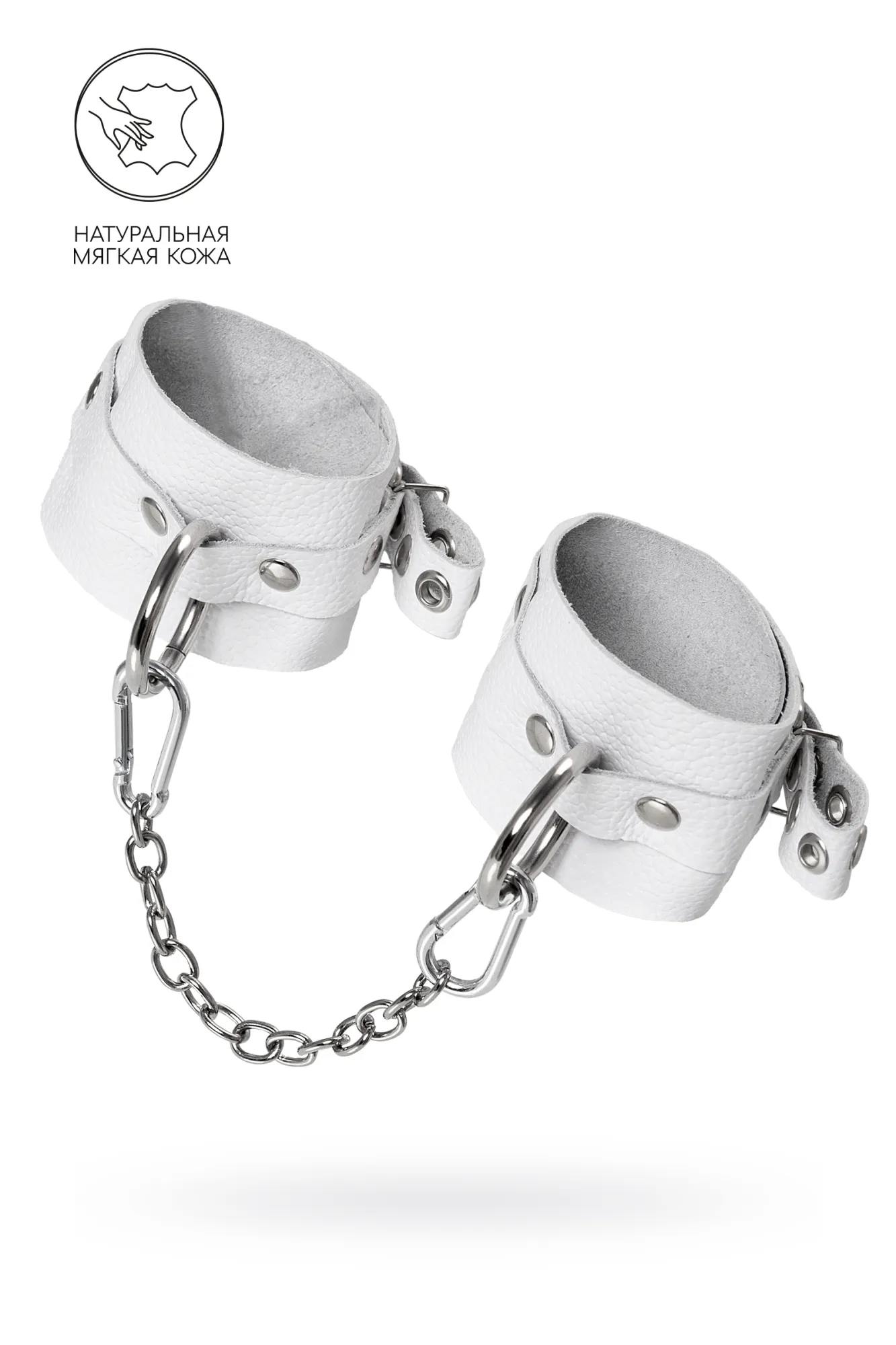 Самый мягкие оковы из всей линейки российского производителя Pecado. Сексуальный атрибут изготовлен из безопасной и натуральной кожи. Насыщенно белый цвет и терпкий аромат материала повышают градус возбуждения в процессе ролевых игр. Манжеты и ремешки девайся очень тактильно приятные. Они не мнутся, не тянутся и обладают повышенной износостойкостью. Вся фурнитура высокого качества. На тонких ремешках имеются отверстия с люверсами, для подбора нужного обхвата. Благодаря стальной застежке аксессуар легко застегивается и расстегивается. Между собой оковы присоединяются с помощью карабинов и короткой цепочки. При необходимости ее можно снять и заменить на более длинный вариант. Используется для того, чтобы обездвижить партнера и зафиксировать ноги в необходимом положении. Подходит как опытным, так и начинающим парам. ● 100% натуральная кожа. ● Ручная работа. ● Износостойкий, тактильно приятный материал. ● Надежная высококачественная фурнитура. ● Универсальный размер. ● Длина манжет – 25 см, ширина манжет - 5,5 см, длина сцепки – 24 см.