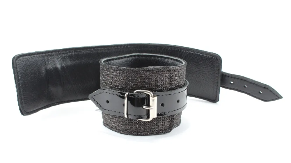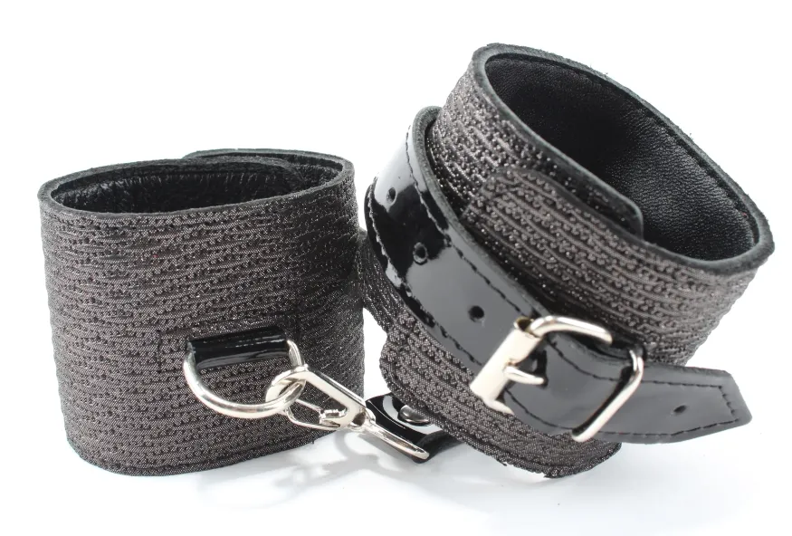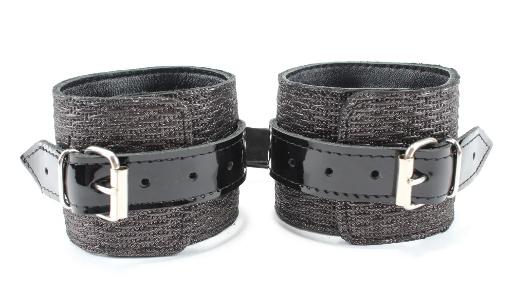 Наручники из натуральной кожи с тиснением и лаковыми ремешками. Сварная металлическая фурнитура и цельный хлястик для надежной фиксации. Ширина - 6 см.,Не нарушают кровообращение, надёжно фиксируются на запястьях с помощью ремешков. Размер универсальный, регулируемый.