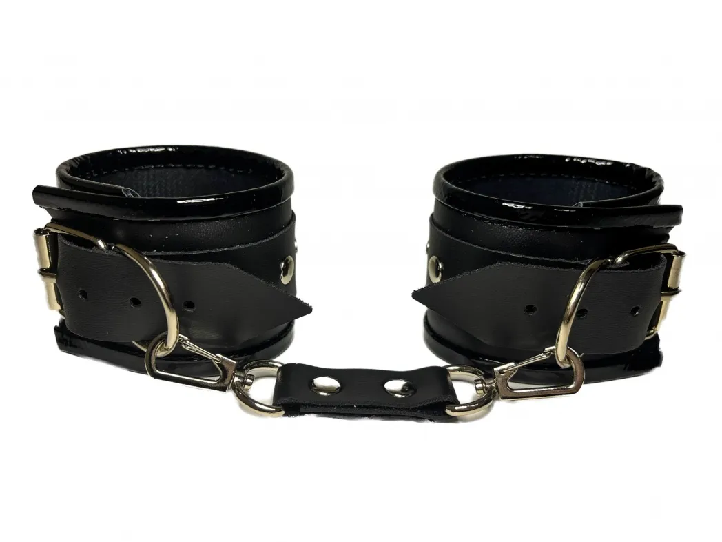 Красивые и функциональные наручники черного цвета, выполненные из искусственной кожи. Декорированы металлической фурнитурой и лаковыми вставками по краям. Обхват удобно регулируется с помощью пряжек. Ширина наручников 5,5см, общая длина наручника вместе с ремешком 31см. В комплекте идет соединение с карабинами, общая длина соединения 11см. Очень экономичный, экологичный и практически незаменимый аксессуар для вашей любовной игры! Материал: эко-кожа, металл Цвет: черный
