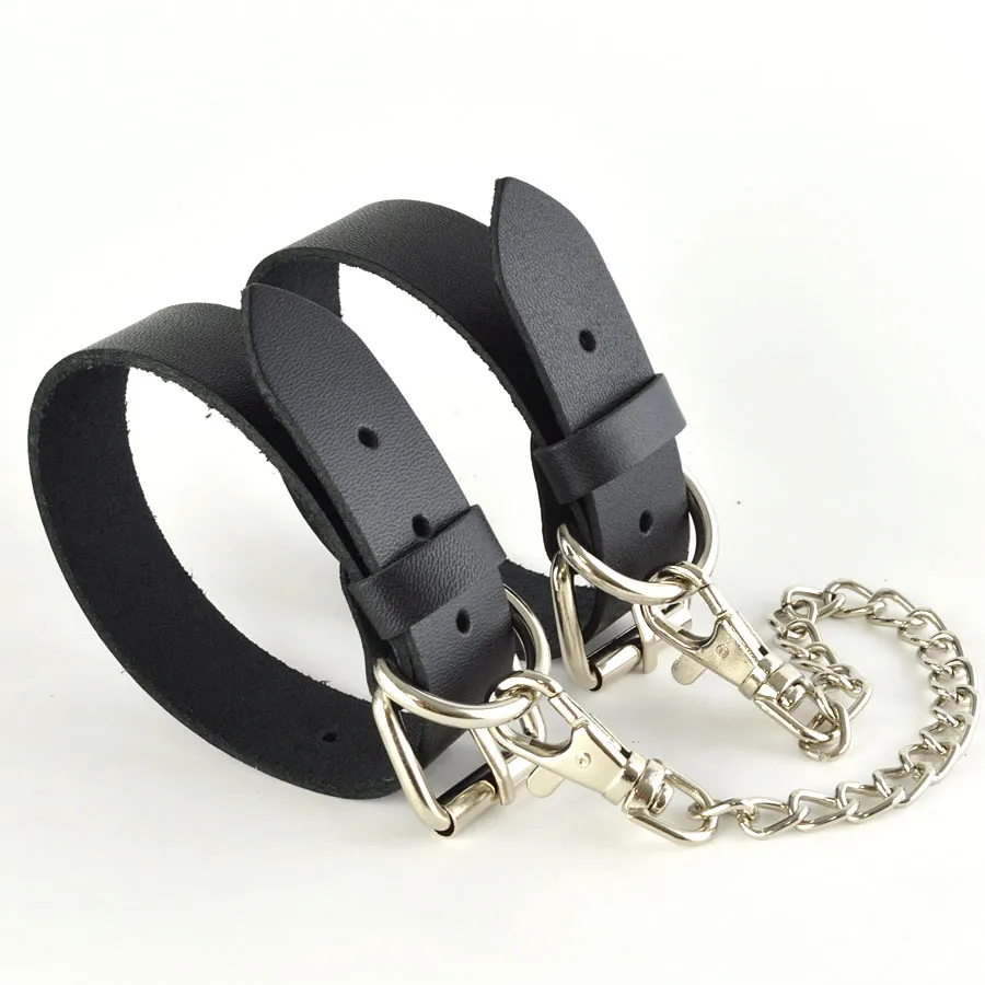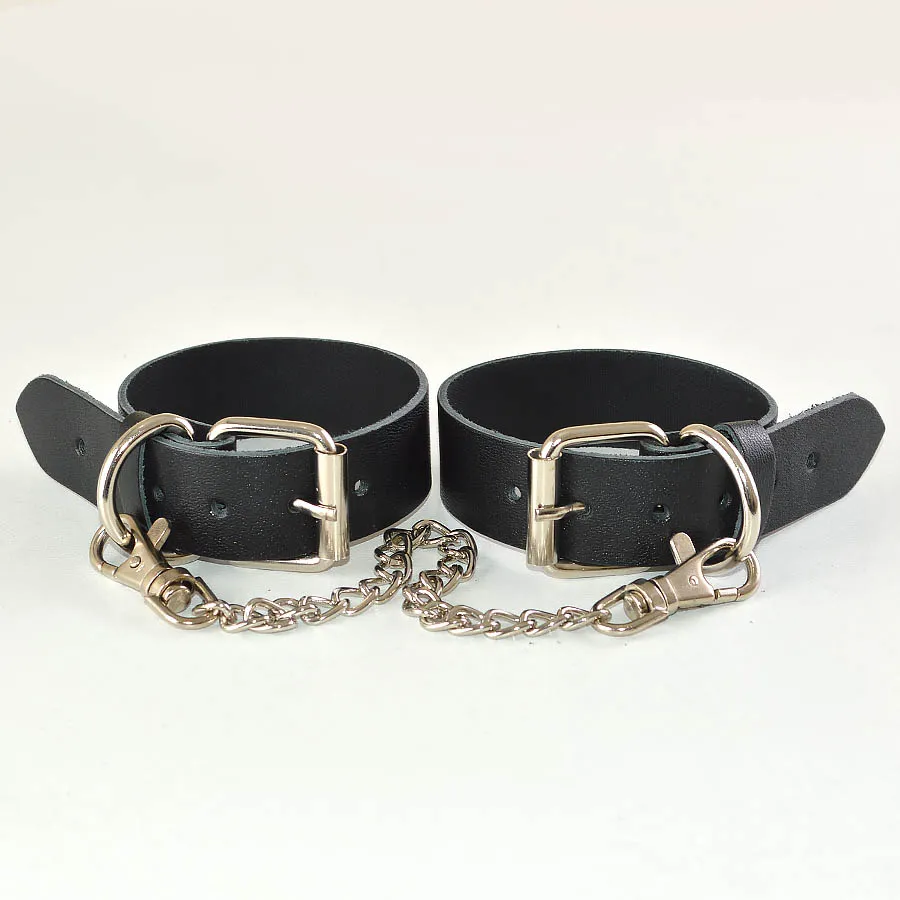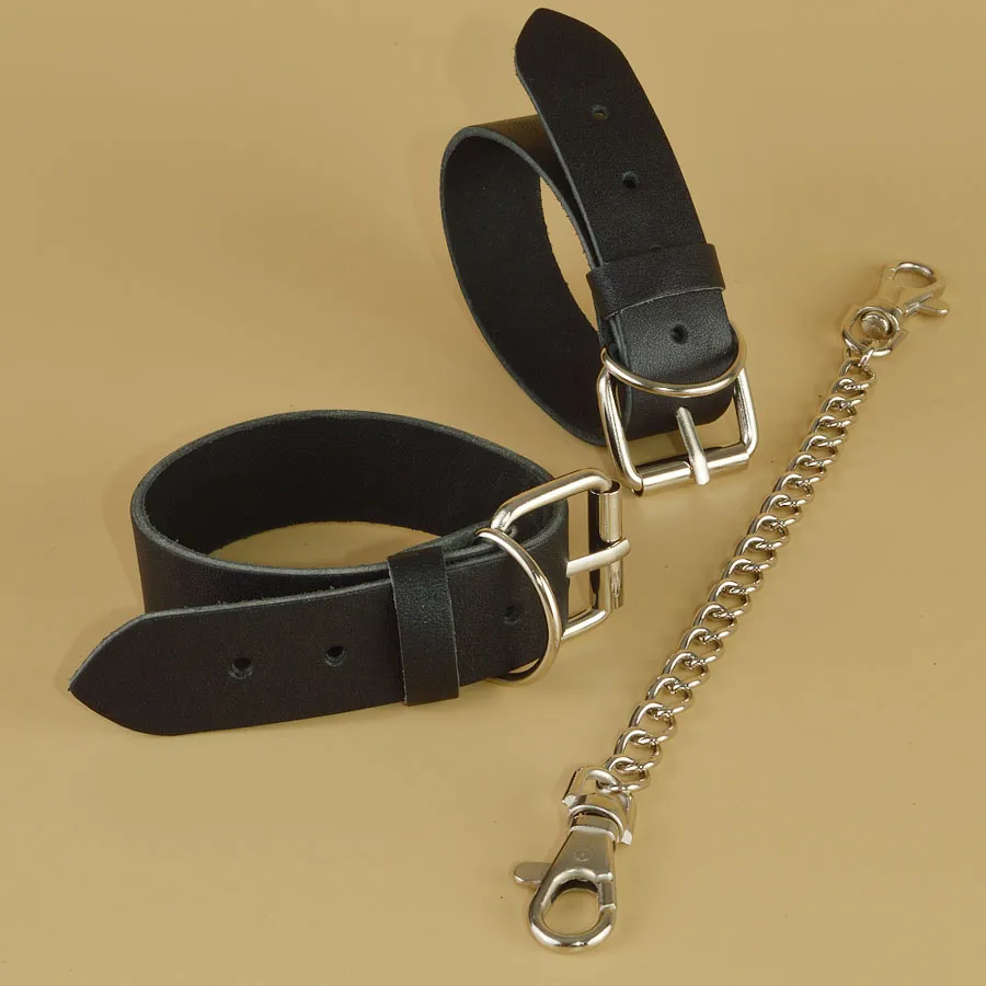 Оковы изготовлены из натуральной кожи. Регулируются пряжкой, имею цепочку с карабинами, длина 24см. Ширина браслета 2,5см. Обхват минимальный 19см, максимальный 26см.  Длина упаковки 16, ширина 10, высота 8 см. Вес брутто 100 г.