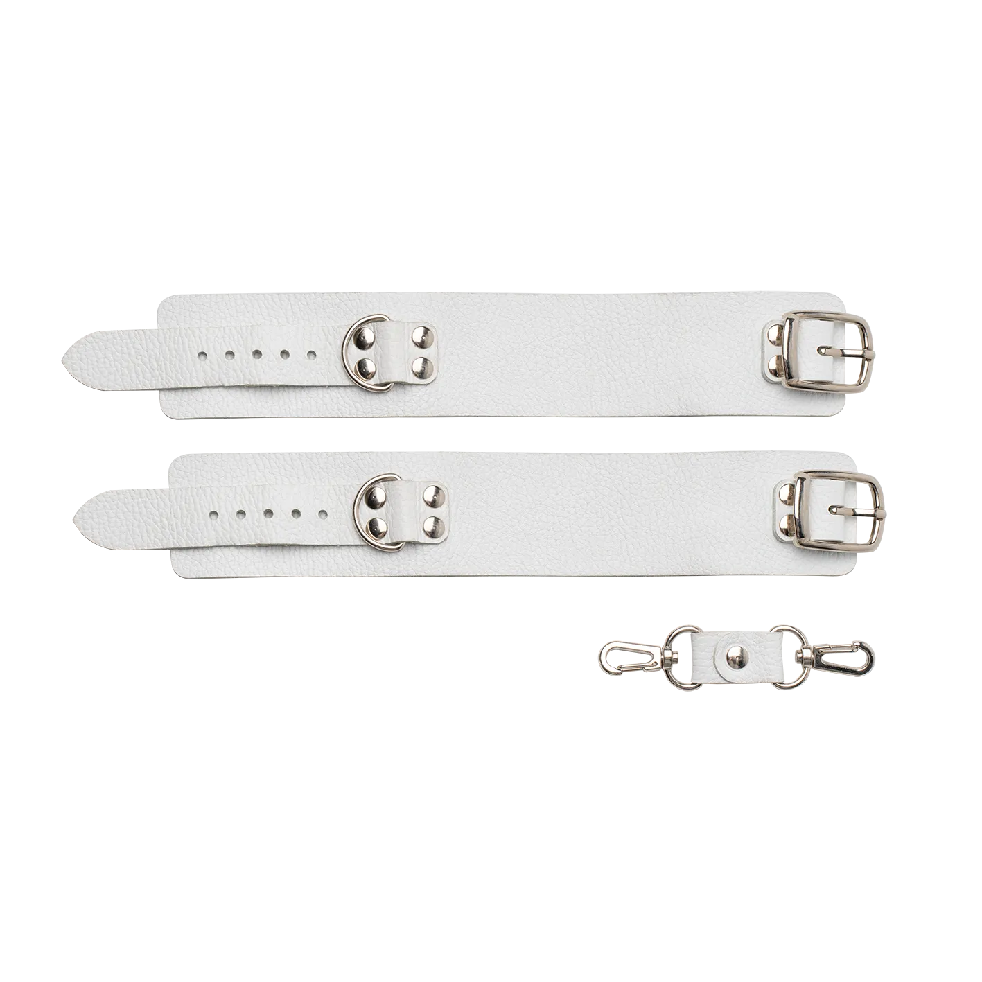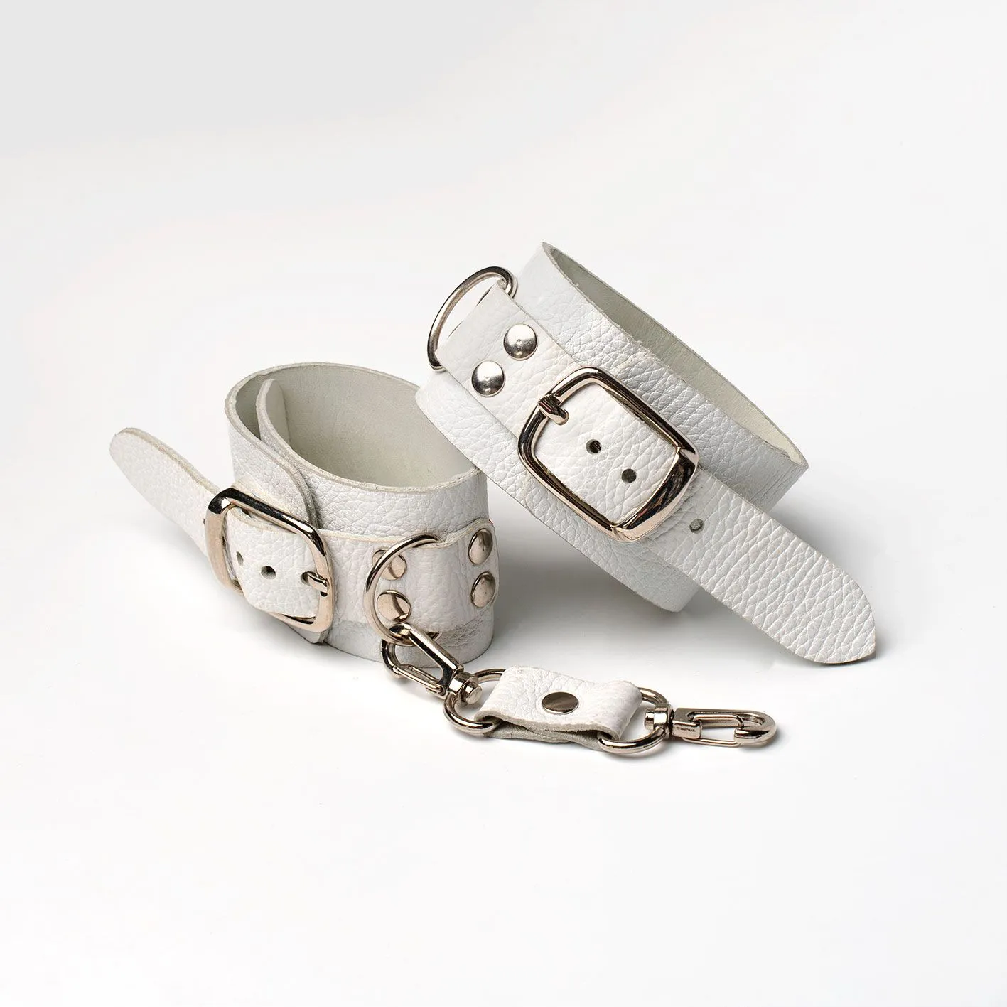 Наручники сделаны из натуральной кожи белого цвета и соединены между собой при помощи кожаной стяжки с карабинами. Такой аксессуар позволит Вам обездвижить руки своего партнера, лишив его возможности сопротивляться и препятствовать Вашим ласкам. Невозможность двигать руками обострит все чувства партнера, делая его особенно чувствительным ко всем прикосновениям. Наручники разнообразят Ваши интимные игры и позволят испытать новые ощущения во время секса.