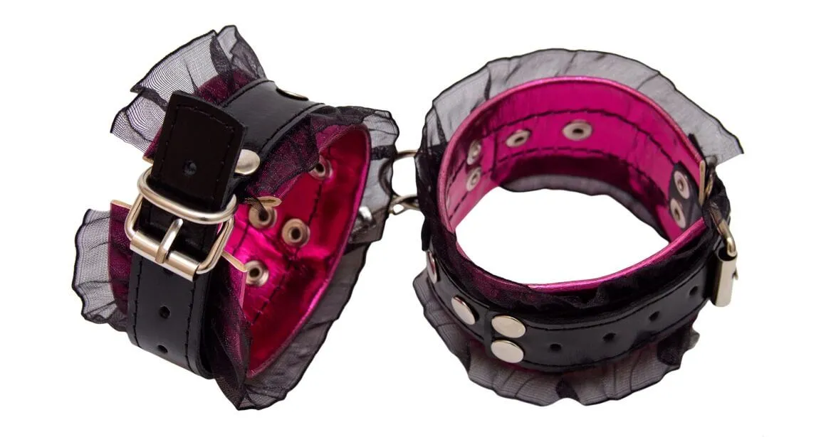 Наручники выполнены из кожи и дополнены нежным кружевом. Регулируются по размеру при помощи ремешков с пряжками. Эта модель является уменьшенной версией похожих наручников.