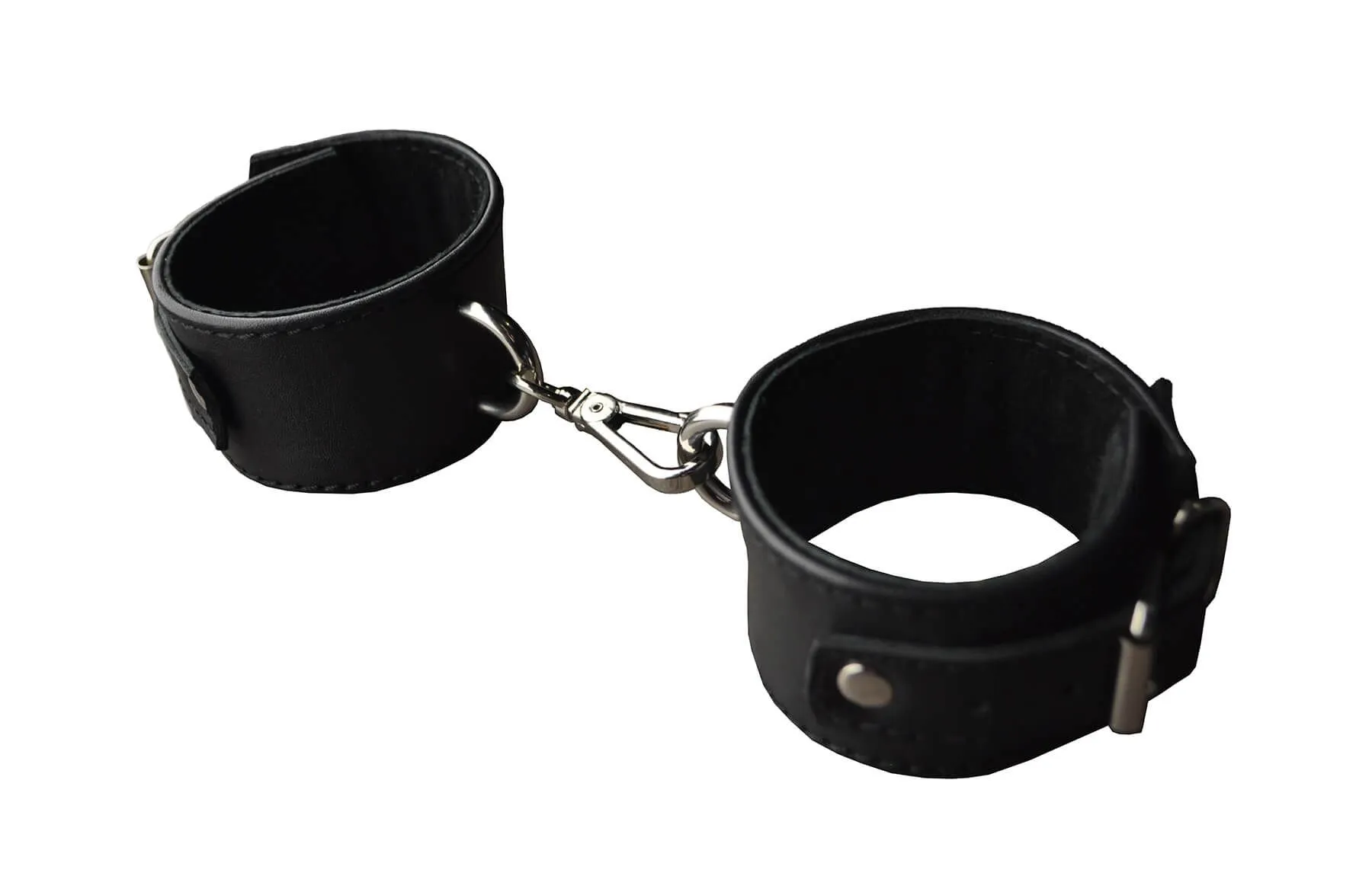 Наручники сделаны из натуральной кожи черного цвета и соединены между собой карабином. Они регулируются по размеру при помощи ремешков с пряжками.