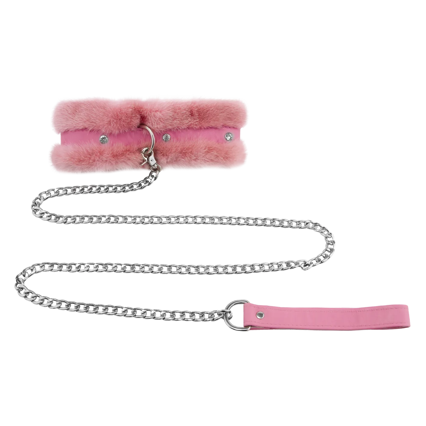 Для любителей доминантных игр — мягкий ошейник из норки, который не давит на шею и не оставляет следов. Прочная цепь, длина 1 метр, при желании, отстёгивается. Украшен стразами и хольнитенами. На конце поводка петля — держатель из натуральной кожи. Достойная замена обычным ошейникам, аналогов которой не имеется.