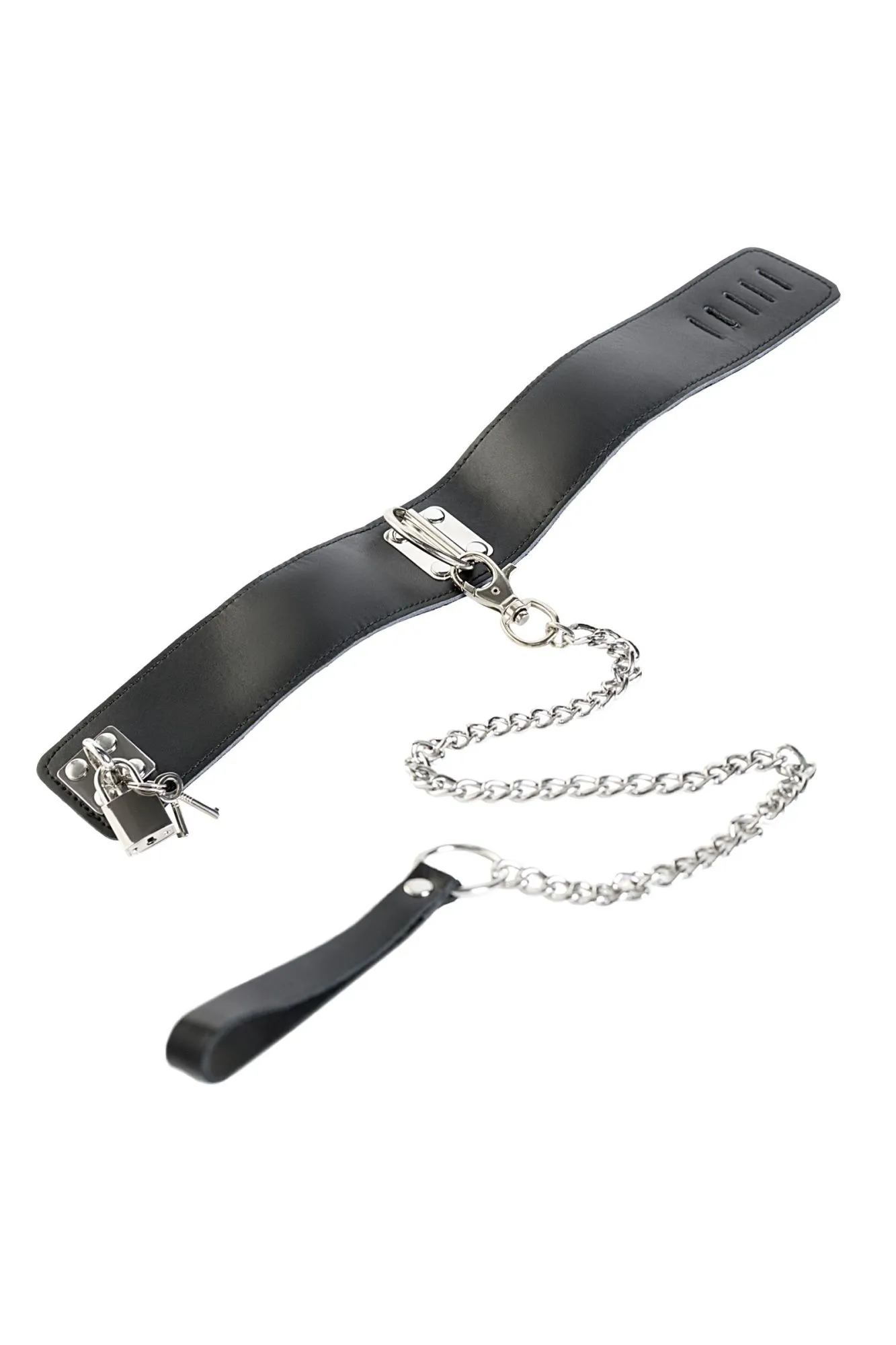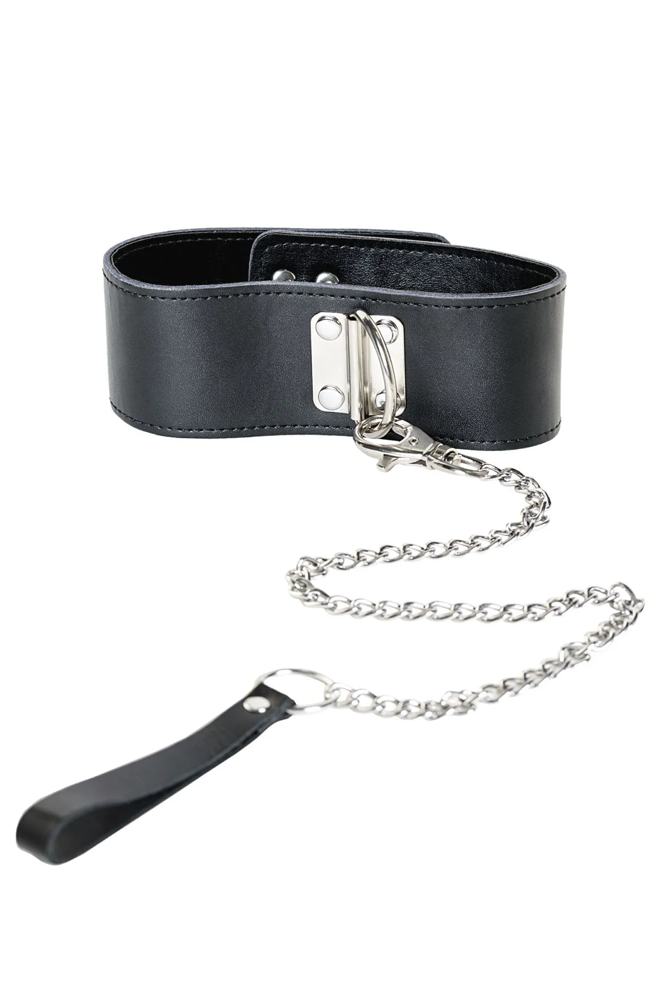 Кожа и металл — в этом ошейнике нет ничего лишнего. А вот дополнительный интересный элемент имеется — кожаный поводок 50 см, застёгивающийся на замок. Такой ошейник точно внесёт пикантные нотки в интимную жизнь.