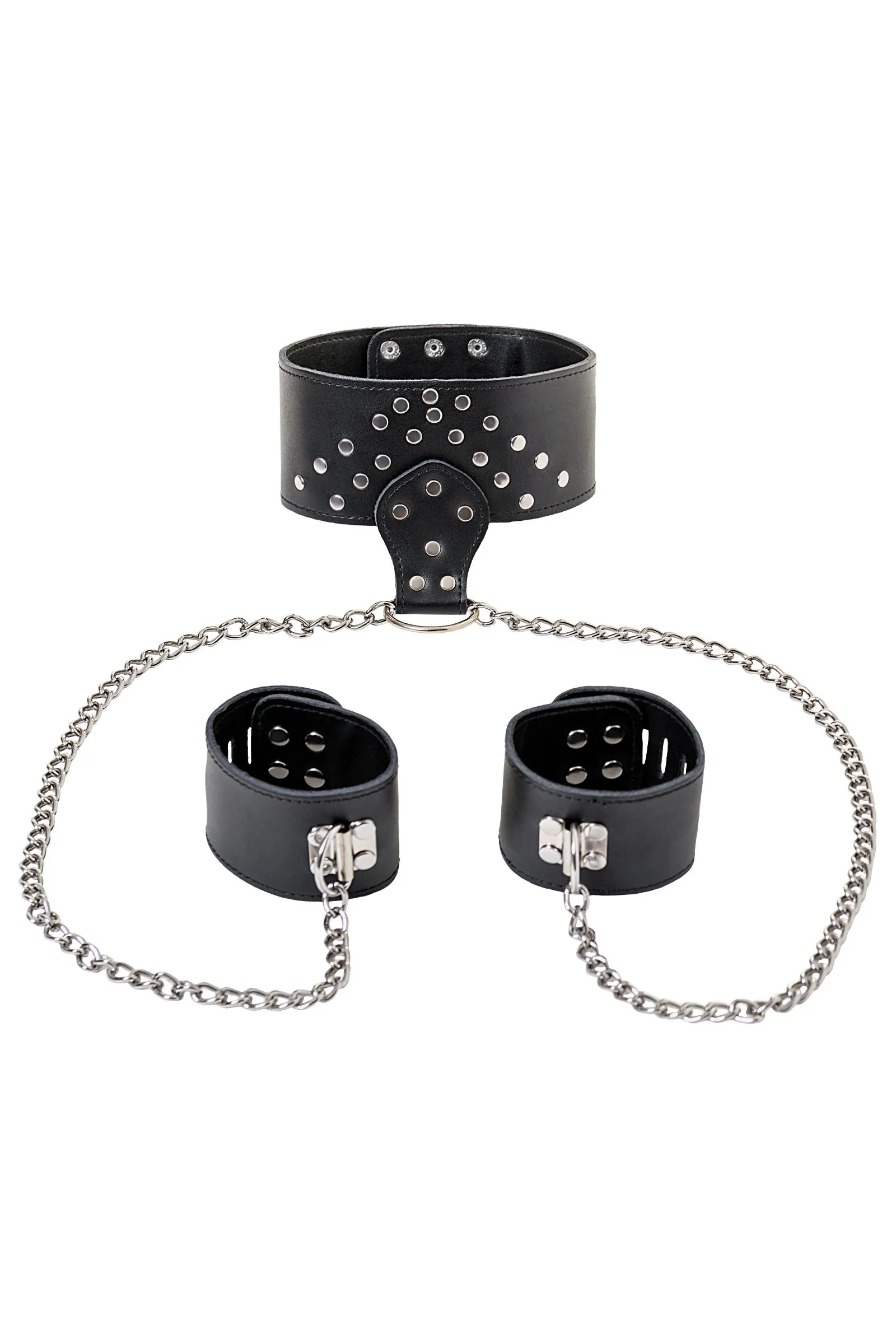 Этот стильный чёрный ошейник из натуральной кожи с блестящими заклёпками соединён 50-сантиметровой металлической цепью с мягкими кожаными наручниками. Он настолько привлекателен и удобен, что примерив ошейник однажды, не захочется отказаться от его использования в дальнейшем.