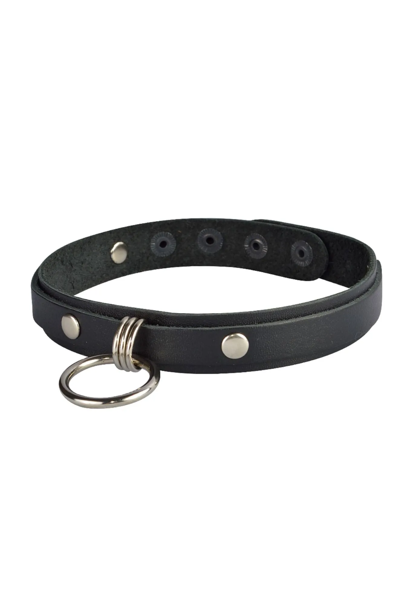 Стильный чокер изготовлен из натуральной кожи чорного цвета и декорирован металлическим кольцом диаметром 3,3 см. Длина чокера 41 см, ширина - 2 см. Вся металлическая фурнитура имеет никелевое покрытие. Регулируется при помощи кнопок.
