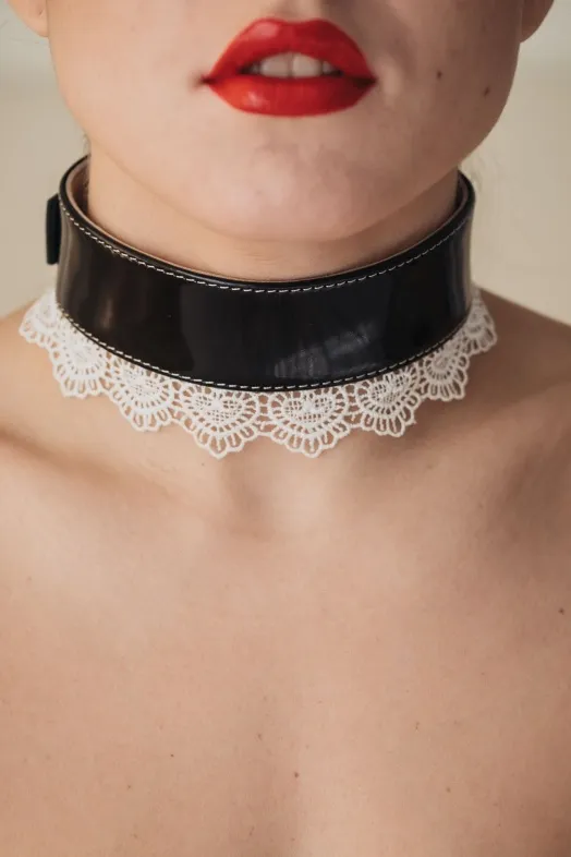 Черный ошейник с белым кружевом, изготовлен из натуральной лаковой кожи. Характеристика: длина ошейника- 41 см, ширина ошейника- 3,8 см, ширина ошейника с кружевом- 6,5 см. Имеет 6 отверстий для регулировки размера. Упаковка: картонная подложка.