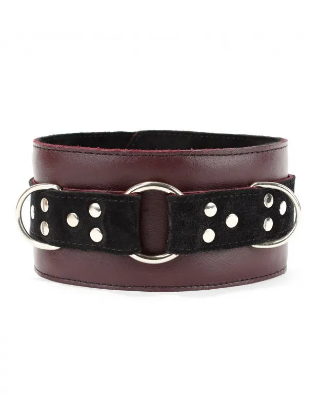 Ошейник выполнен  из натуральной кожи бордового цвета,  декорирован вставкой из черной замши, заклепками, металлическим кольцом  и двумя полукольцами. Сзади аксессуар надежно фиксируется пряжкой,  ремень  позволяет  выбрать нужный размер.  Мягкий подклад  из замши обеспечит комфортное пребывание в аксессуаре.