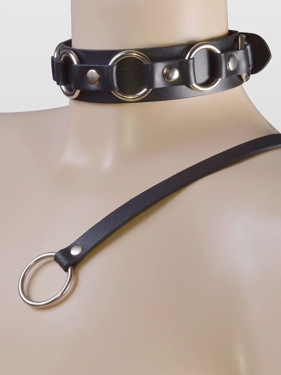 Ошейник изготовлен из натуральной кожи, декорирован шестью металлическими кольцам. Размер регулируется при помощи пряжки.