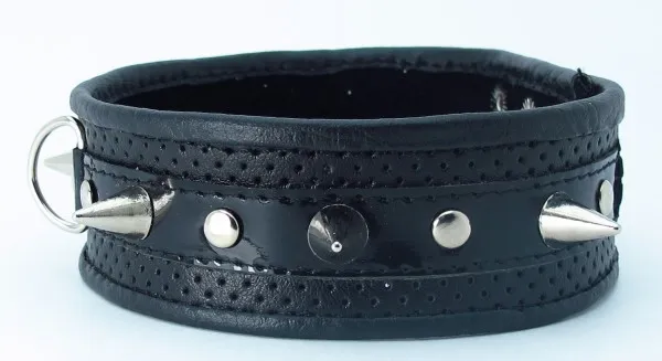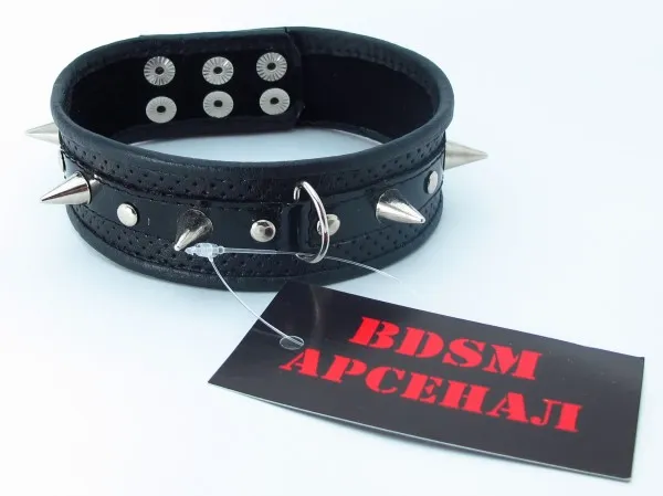 Ошейник черного цвета, выполнен из высококачественной кожи. Основание - перфорированная кожа, Вставка- кожа лак.Ширина фетиш атрибута составляет 3,5 сантиметров, имеет черную лаковую вставку, украшен шестью небольшими шипами по всей длине изделия. Размер регулируется при помощи застежек-кнопок. Для крепления различных элементов бандажа, а также поводков и цепочек на БДСМ девайсе предусмотрено одно сварное D-видное кольцо. Общая длина ошейника - 41 см