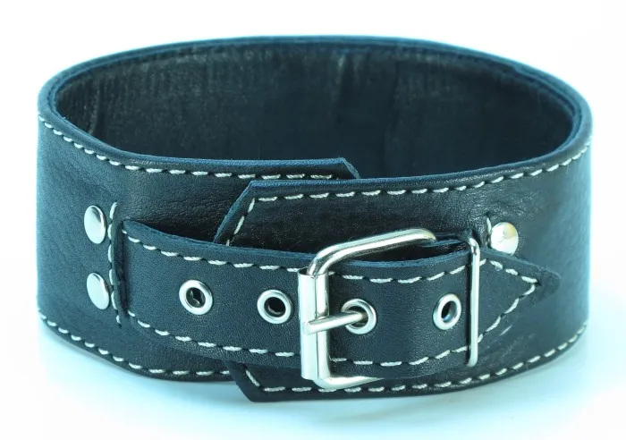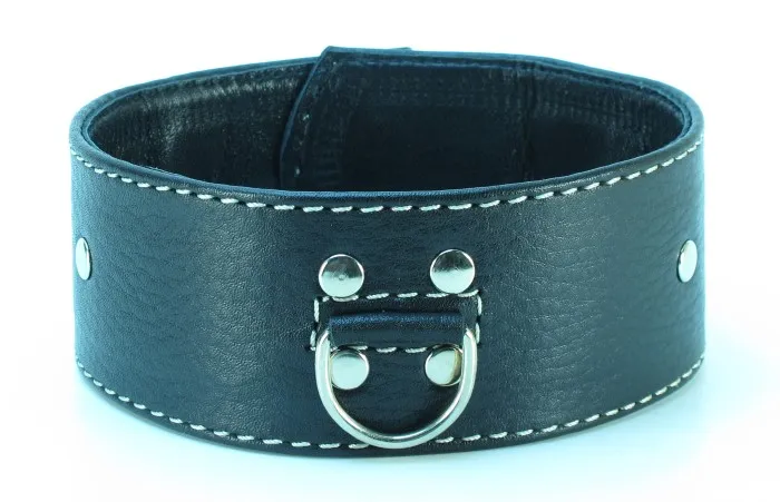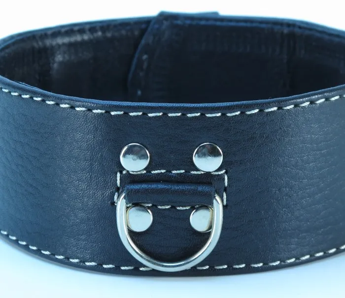 Черный кожаный ошейник с белой отстрочкой. Имеет D-кольцо для карабина. Характеристика: ширина ошейника - 5,2 см, общая длина ошейника- 42 см. Имеет 5 отверстий для регулировки размера.