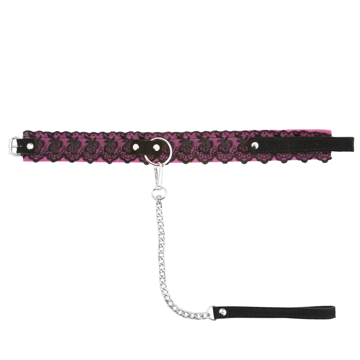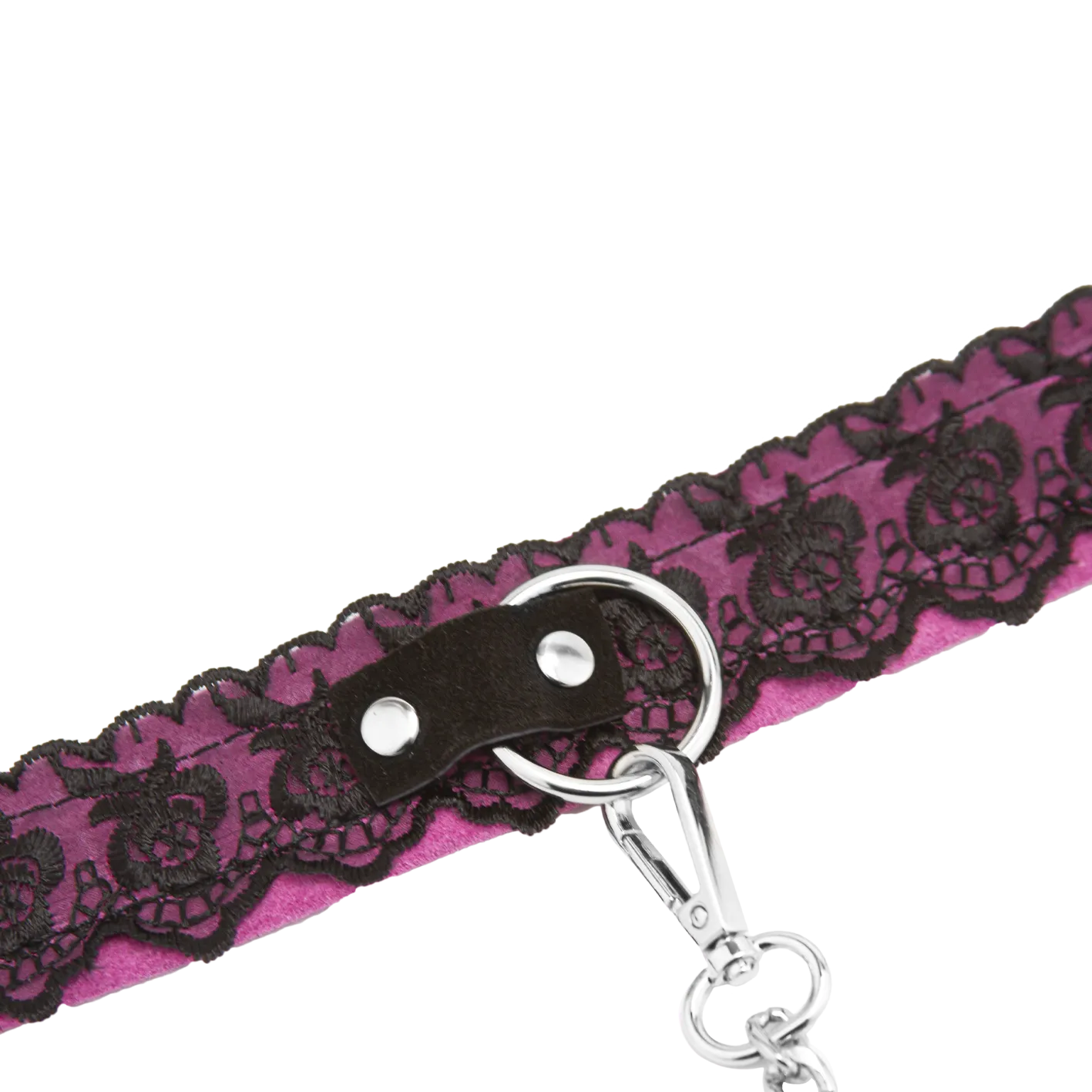 —Ошейник из замши розовый с черным кружевом и поводком цепь