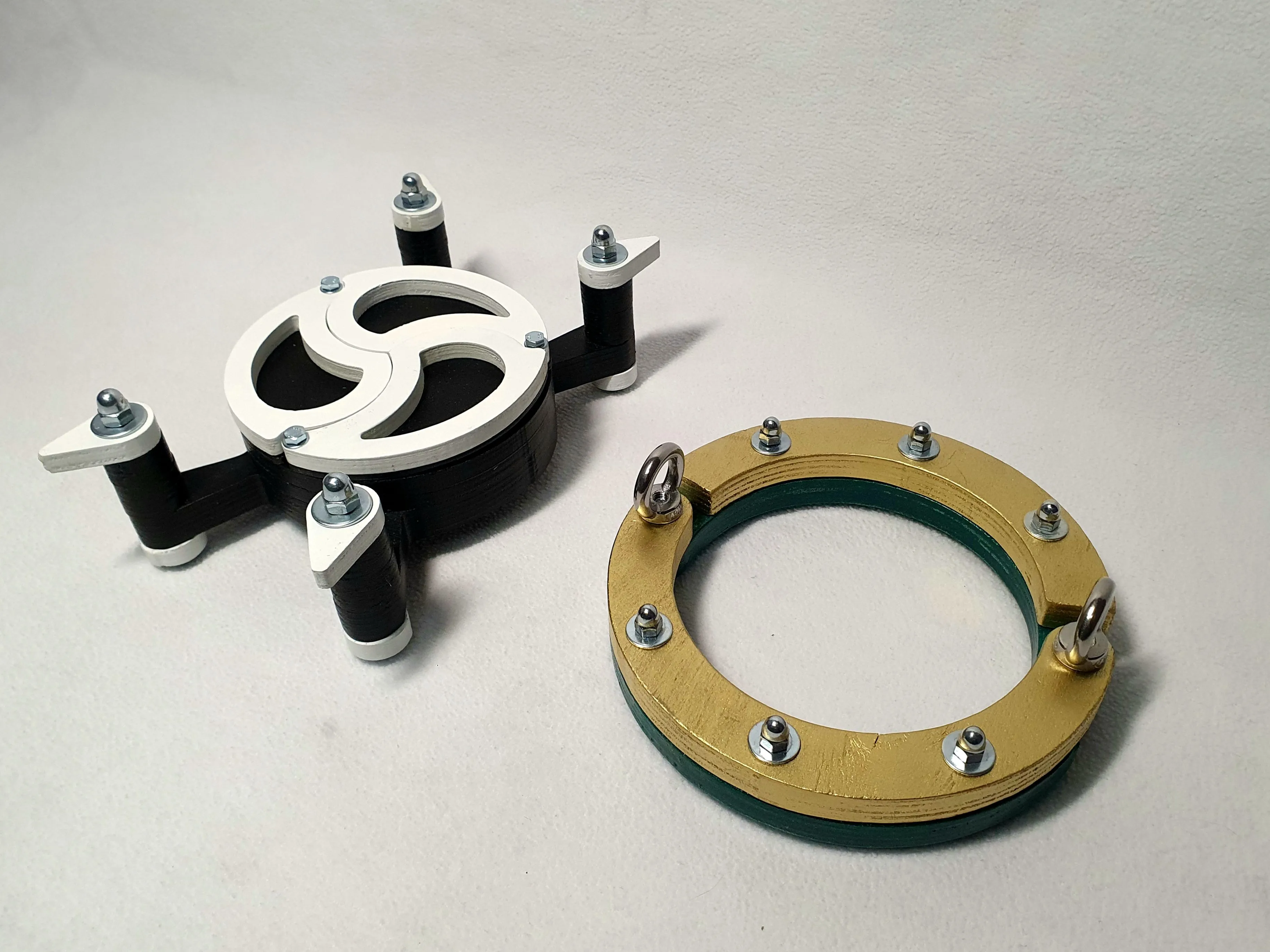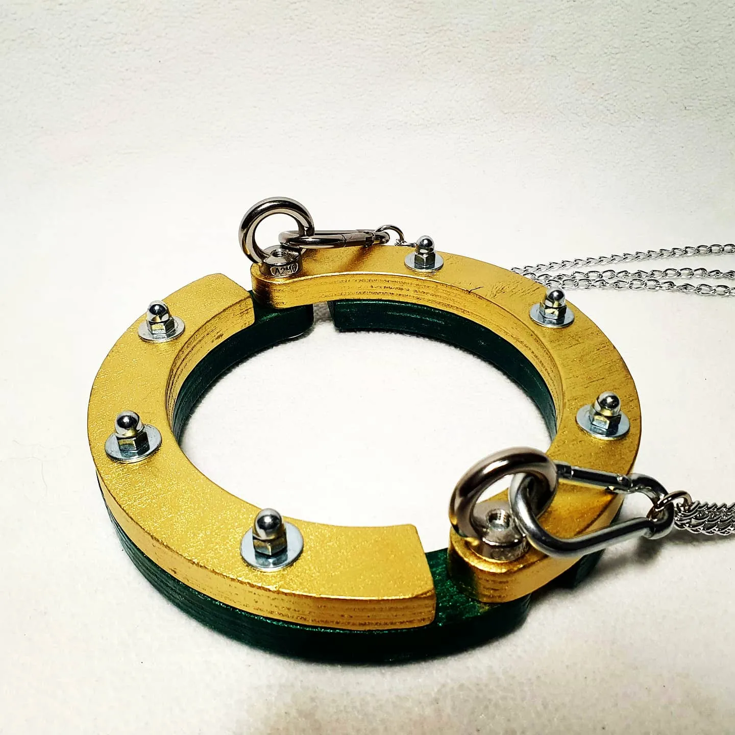 Доступны 4 размера по внутреннему диаметру чокера. Может быть выполнен в одном, двух или трех цветах, а также дополнительно покрыт фосфоресцентной эмалью (будет светиться в темноте). Изготавливается из фанеры, есть возможность изготовить из массива любых пород дерева.