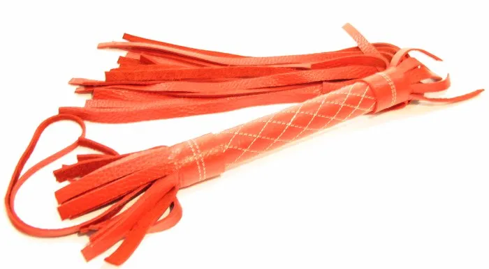Аккуратная красная плетка, изготовленная из натуральной кожи. Имеет жесткую ручку длиной 17 см, так же покрытую кожей и прсотроченную белыми нитями. Имеется петля для удобного использования плети. Длина хлыстов - 27 см. Общая длина плети - 51 см.