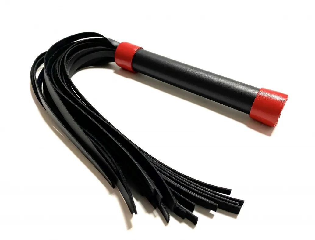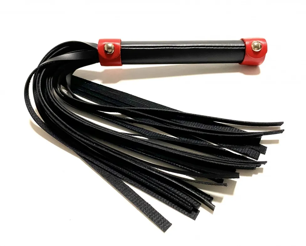 Стильная лаконичная плеть, выполненная из чёрной матовой эко-кожи. Рукоятка декорирована ярко-красными полосками, что добавляет контраста . Общая длина аксессуара 42см, диаметр рукоятки 2,5см. Эта плеть поможет разнообразить вашу БДСМ игру и подарит новые ощущения. Экономичный, экологичный и красивый аксессуар! Материал: эко-кожа, металл Цвет: черный, красный