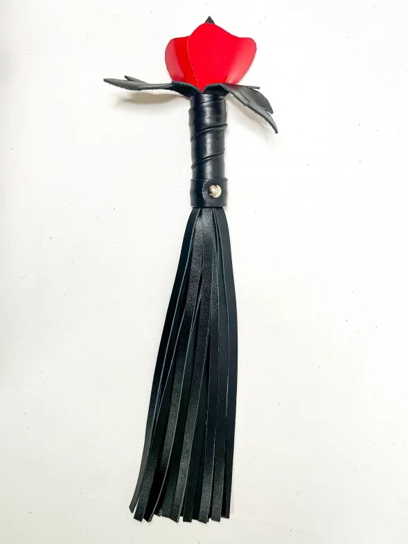 Восхитительная мини-плеть, украшенная красной розой. Цветок полностью выполнен из натуральной лаковой кожи, листочки розы,рукоятка и хвосты плети-натуральная мягкая кожа.Размеры этой плети очень изящны- общая длина всего 40см, поэтому данную плеть можно использовать, как генитальную, чтобы добавить новых ярких ощущений. Розочка очень удобно лежит в руке и создает неповторимую атмосферу и настроение, этот аксессуар никого не оставит равнодушным!