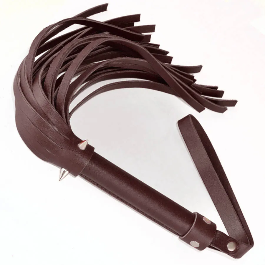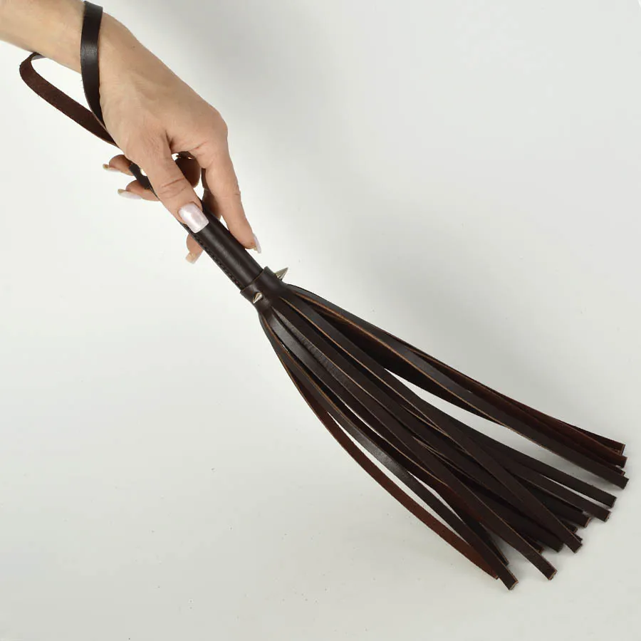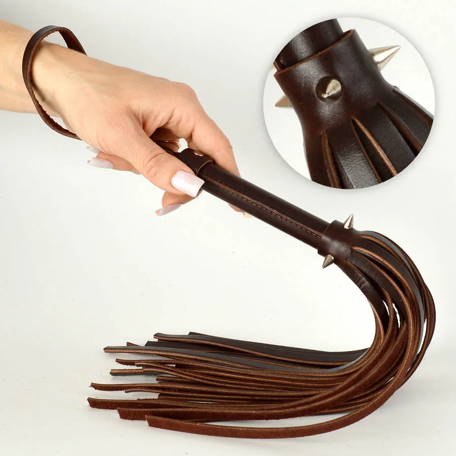 Плеть изготовлена из натуральной коричневой кожи и украшена тремя металлическими  шипами. Общая длина - 40 см, длина ударной части 26 см.  Длина шипов 1 см.