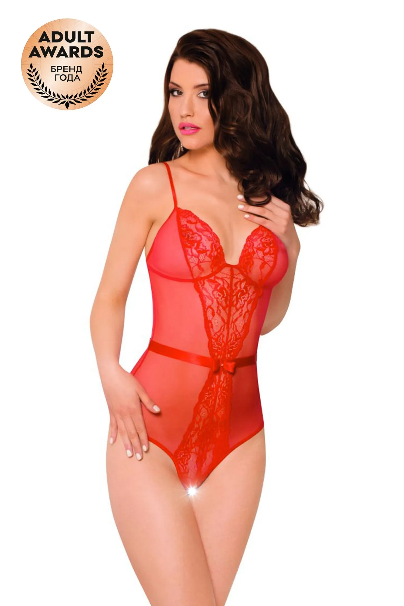 Боди с открытым доступом, выполненное из тонкой сетки. Спина открытая, регулируемые бретели, сзади декоративный бант. Спереди боди декорировано кружевной вставкой в форме песочных часов.
