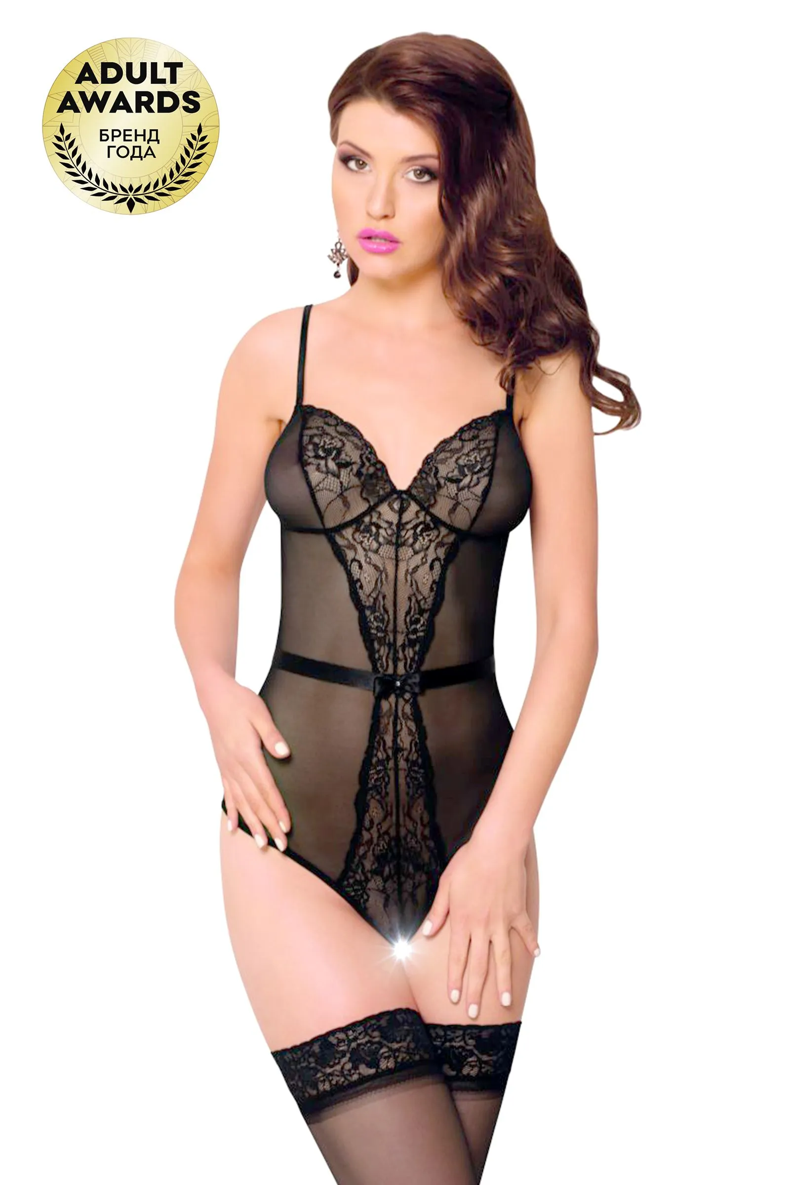 Боди с открытым доступом, выполненное из тонкой сетки. Спина открытая, регулируемые бретели, сзади декоративный бант. Спереди боди декорировано кружевной вставкой в форме песочных часов.