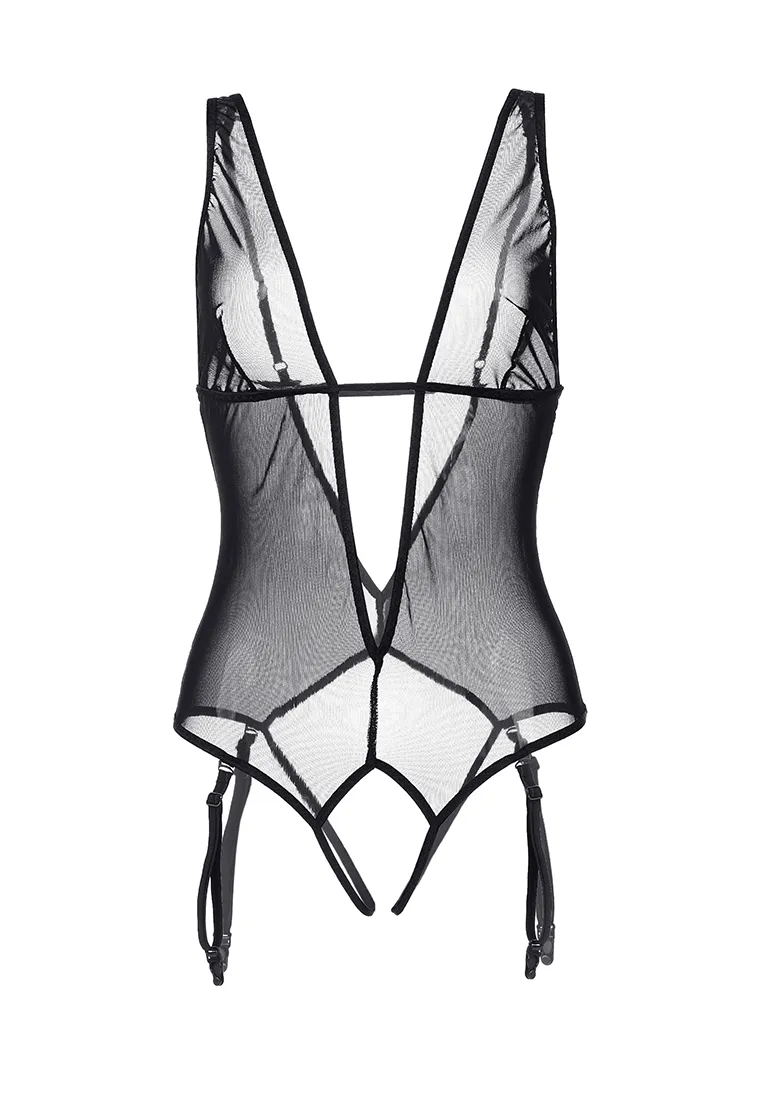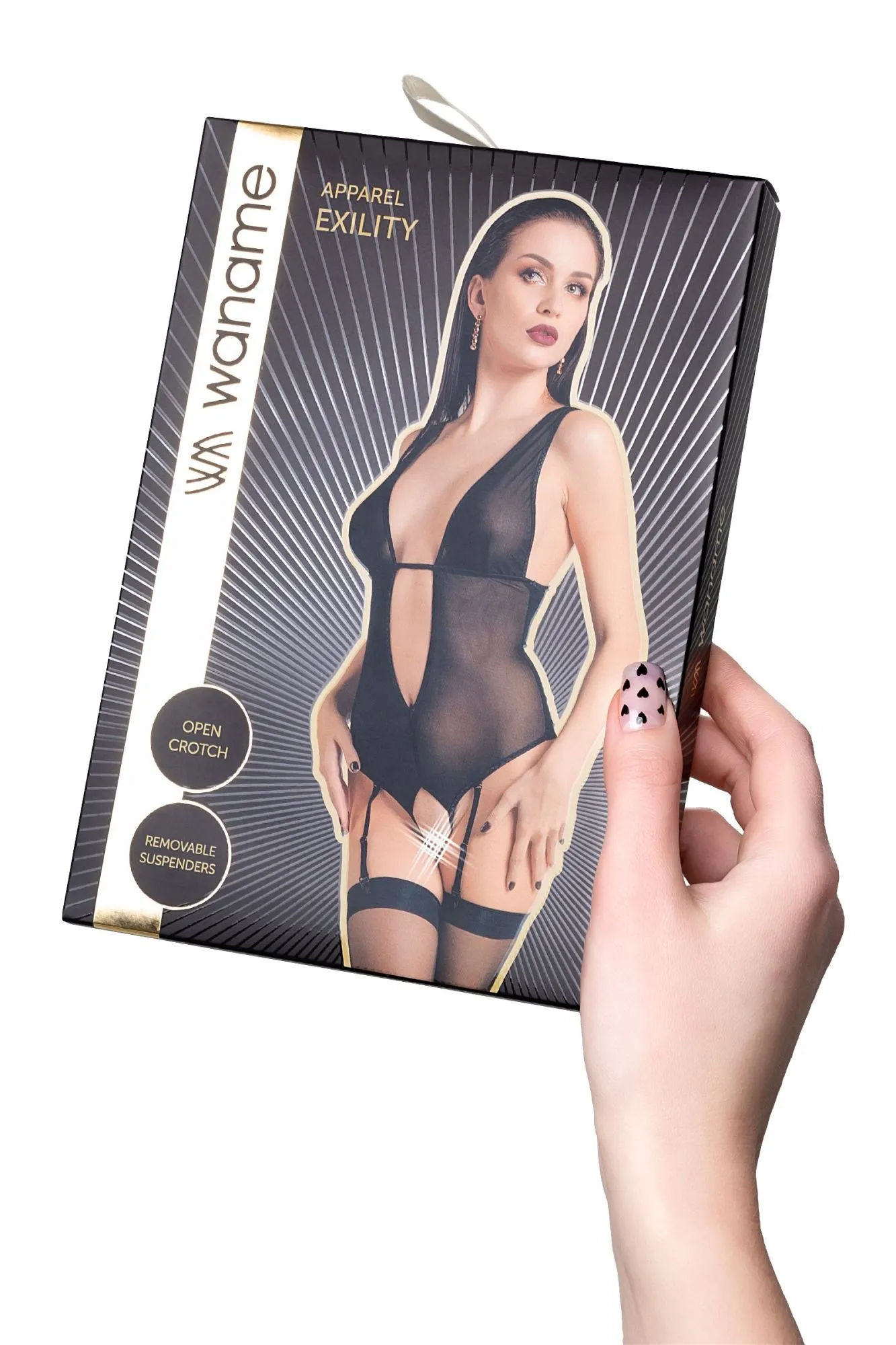 Линия провокационного эротического белья WANAME® Apparel — для женщин, которые достойны наслаждения и не скрывают этого. Эротическое боди с глубоким декольте и пажами для чулок «Экзи́лити» (англ. Exility — «Утонченность») из тонкой прозрачной эластичной сетки эффектно облегает фигуру. Ощущается совсем невесомым, не сковывает движений, но визуально меняет силуэт. Шелковистая поверхность материала дарит приятные ощущения при прикосновении. А современные элементы дизайна боди тешат женское самолюбие. Глубокое декольте акцентирует внимание на нежной коже бюста и дополняет образ вертикальными линиями. Вытачки в районе груди, горизонтальная отделка и регулируемые бретели обеспечивают идеальную посадку. Пажи спереди и сзади легко отстегиваются и дают возможность изменить свой образ в считанные секунды. Открытая спина, обширный эротический доступ — важные детали чувственного образа. Белье Waname® Apparel эксклюзивно, разработано и произведено в России с учетом предпочтений российских покупательниц. *Чулки в комплект не входят.