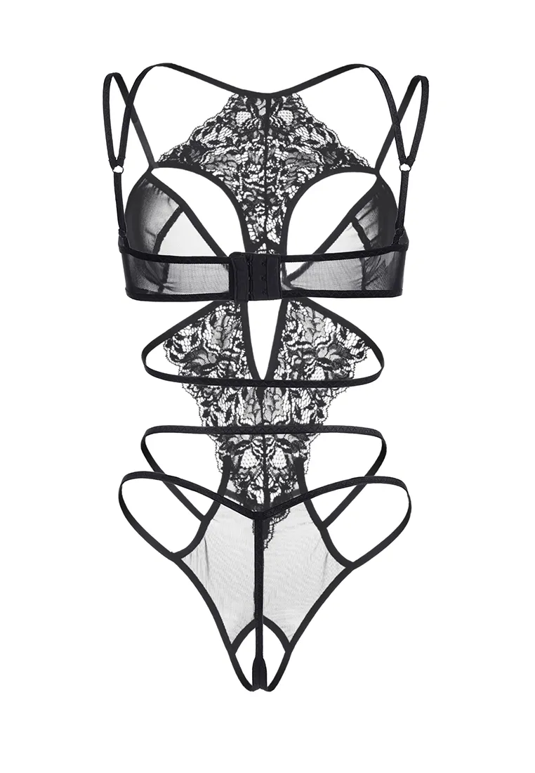 Эротическое боди с кружевным жабо Erolanta® Eva из эластичной сетки со вставками кружева со свободным краем. Фигурные вырезы открывают верхнюю часть груди. Регулируемые бретели и застежка на спине. *Допускается замена кружева на аналогичное.