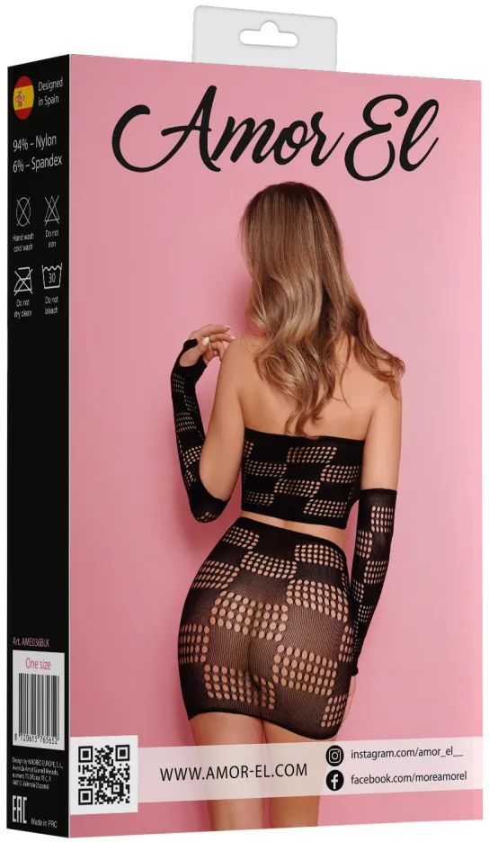 Комплект соблазнительного сетчатого белья, состоящего из откровенного топа, отдельных рукавов и короткой юбки.