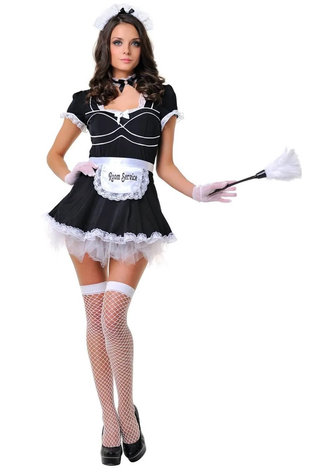 платье, белый передник на завязках, чулки, перчатки, повязка на шею с атласным бантиком и кружевная повязка на голову. Внимание, щеточка в комплект не входит.