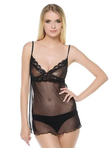 Нежная сорочка из мягкой сетчатой ткани, кокетка и лиф отделаны кружевом. Прозрачная ткань одновременно интригует, но и не скрывает ваших прелестей. Прекрасный эротический образ для горячей ночи с любимым.
