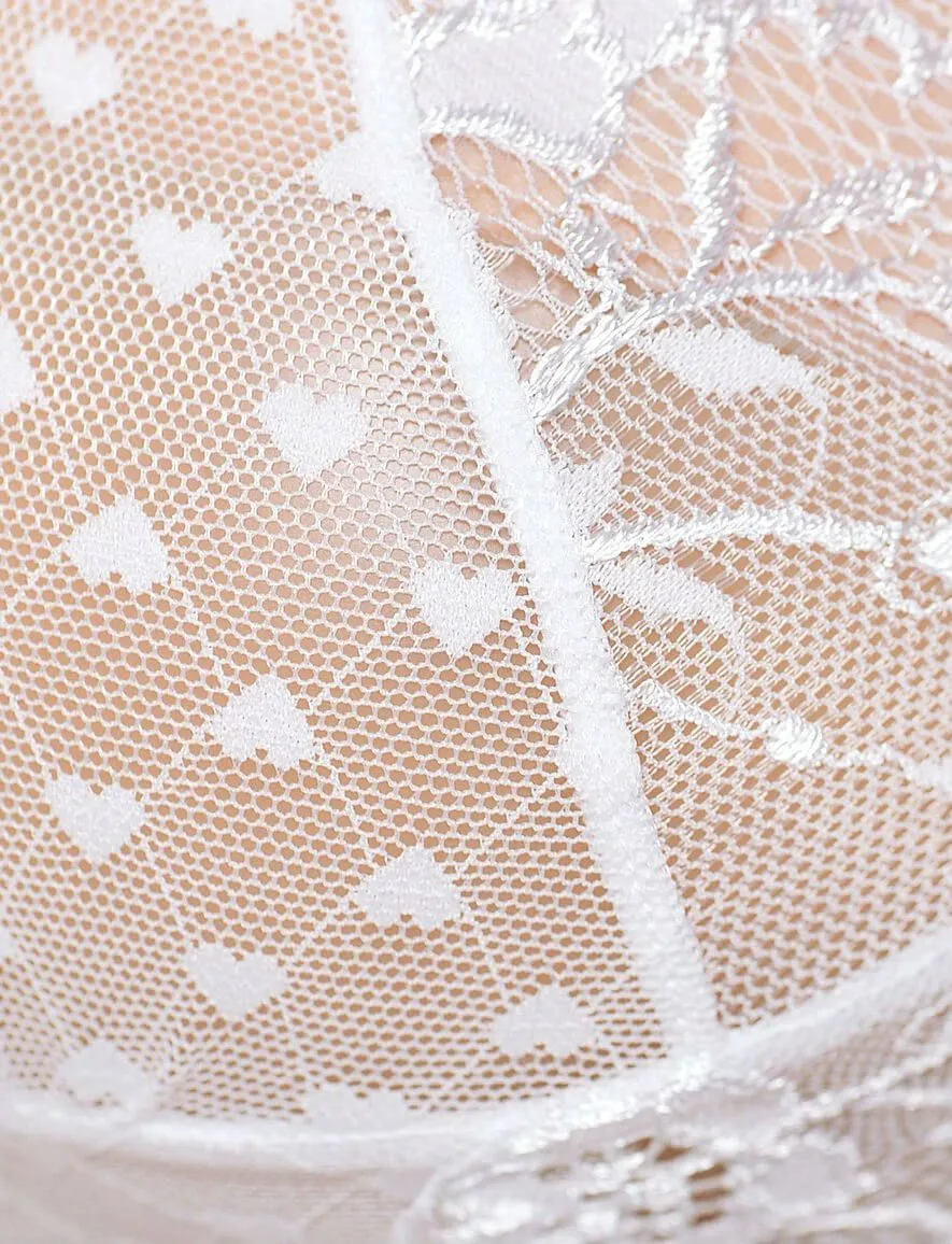 Нежный комплект белья от компании Opium состоит из обтягивающей камисоли (короткого топа на бретельках) и трусиков-стринг одинакового цвета. Камисоль выполнена из мягкой сетчатой ткани с узором "сердечко", спереди ее украшает широкая кружевная полоса с цветочным орнаментом. Также модель декорирована очаровательными розовыми бантиками, делающими этот комплект еще более чувственным. У камисоли есть отстегивающиеся подвязки для чулок, которые придают изделию изысканность и сексуальность.