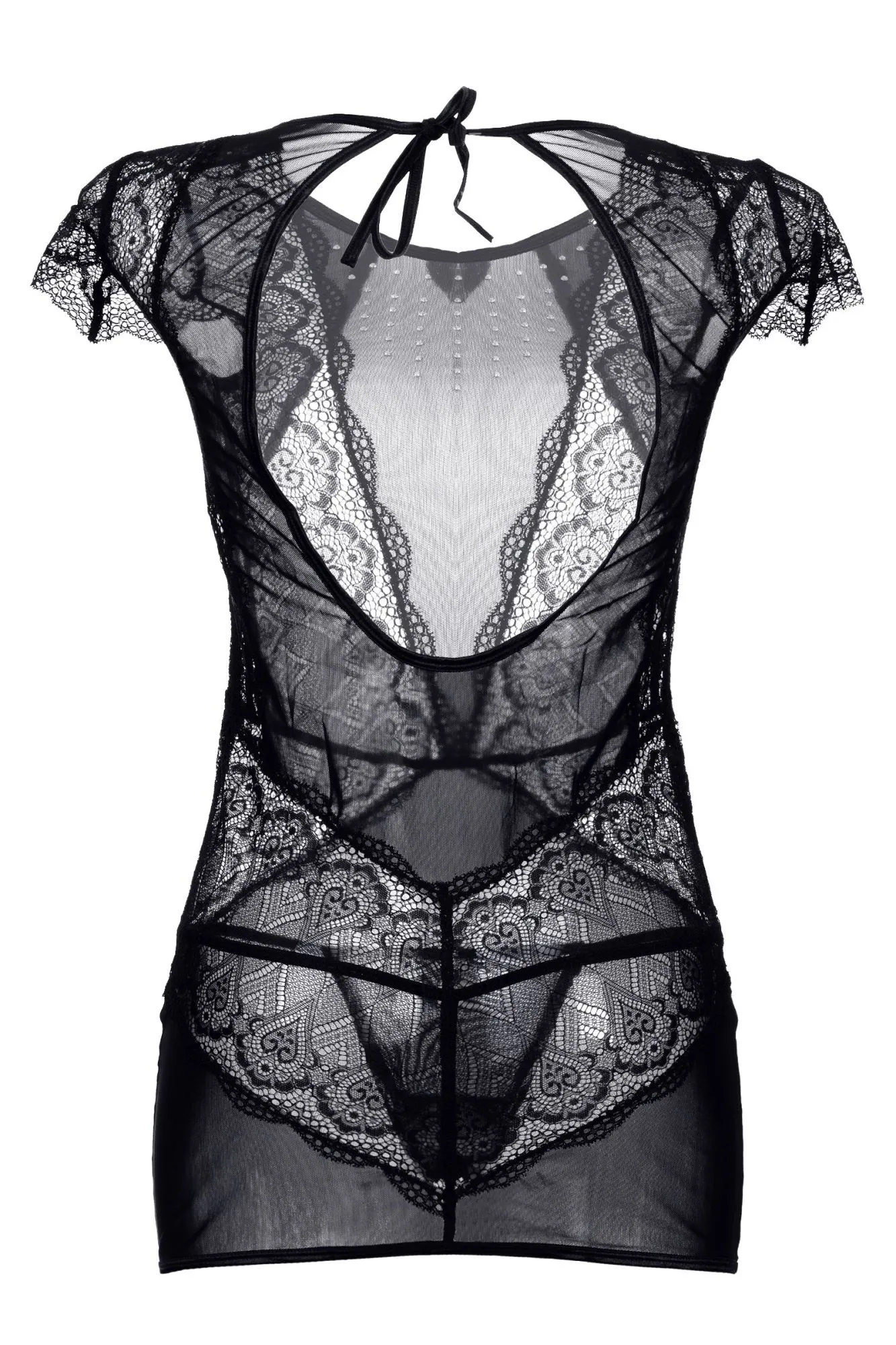 Платье Candy Girl® Estelle из эластичной сетки с шикарным рельефным кружевом, открытой спиной и миниатюрными рукавами украшено россыпью серебристых страз в зоне декольте. Продуманный дизайн визуально формирует приталенный силуэт. Завязки на шее сзади позволяют снять наряд в считанные мгновения. Т-стринги в комплекте.